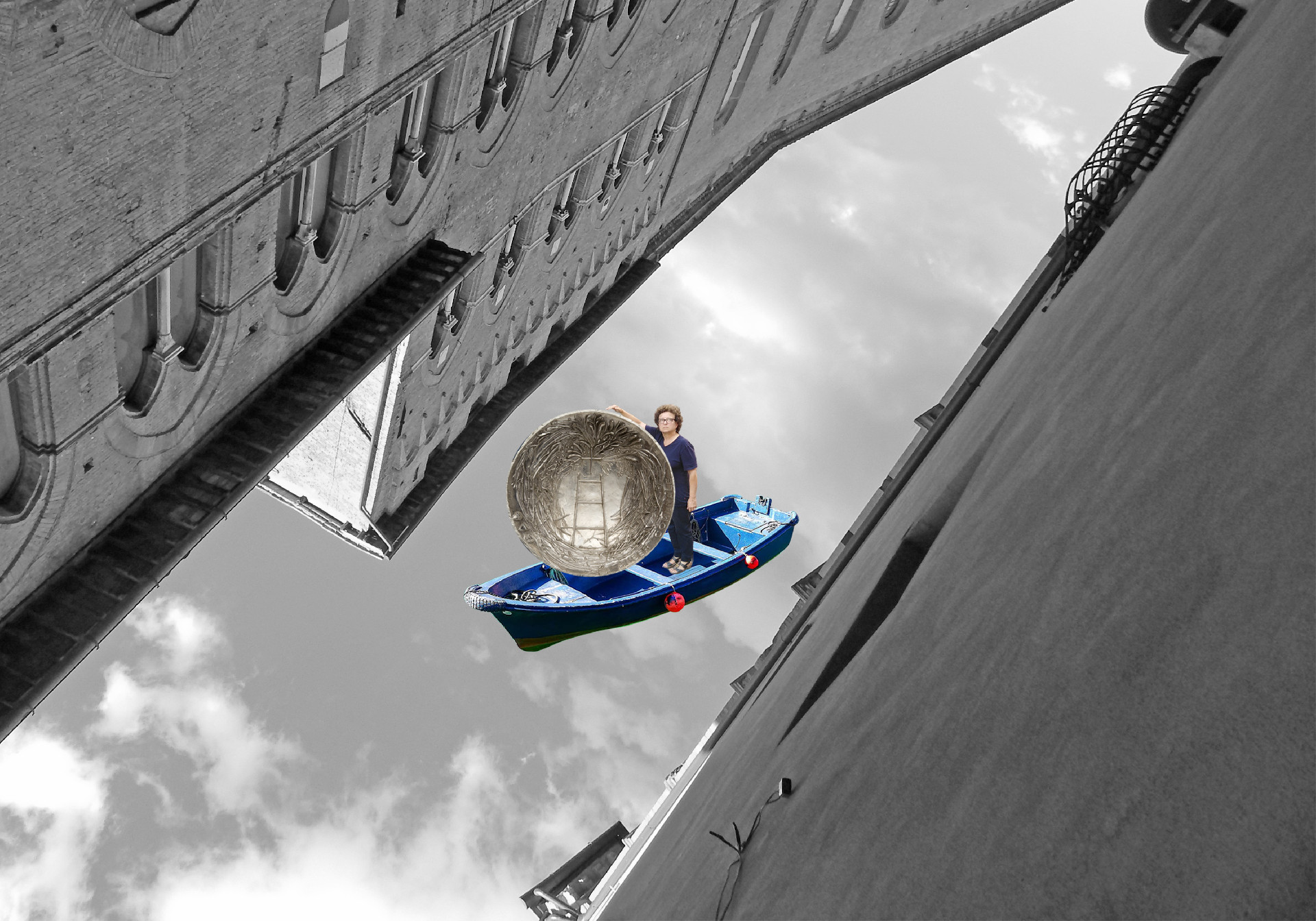 L’altro collage invece che raffigura me e il masgalano su una barchetta in una sorta di canale nel cielo del Santa Maria della Scala, con i palazzi al rovescio sta a significare un percorso che giunto alla fine mi consegna ad una parte di storia di Siena.