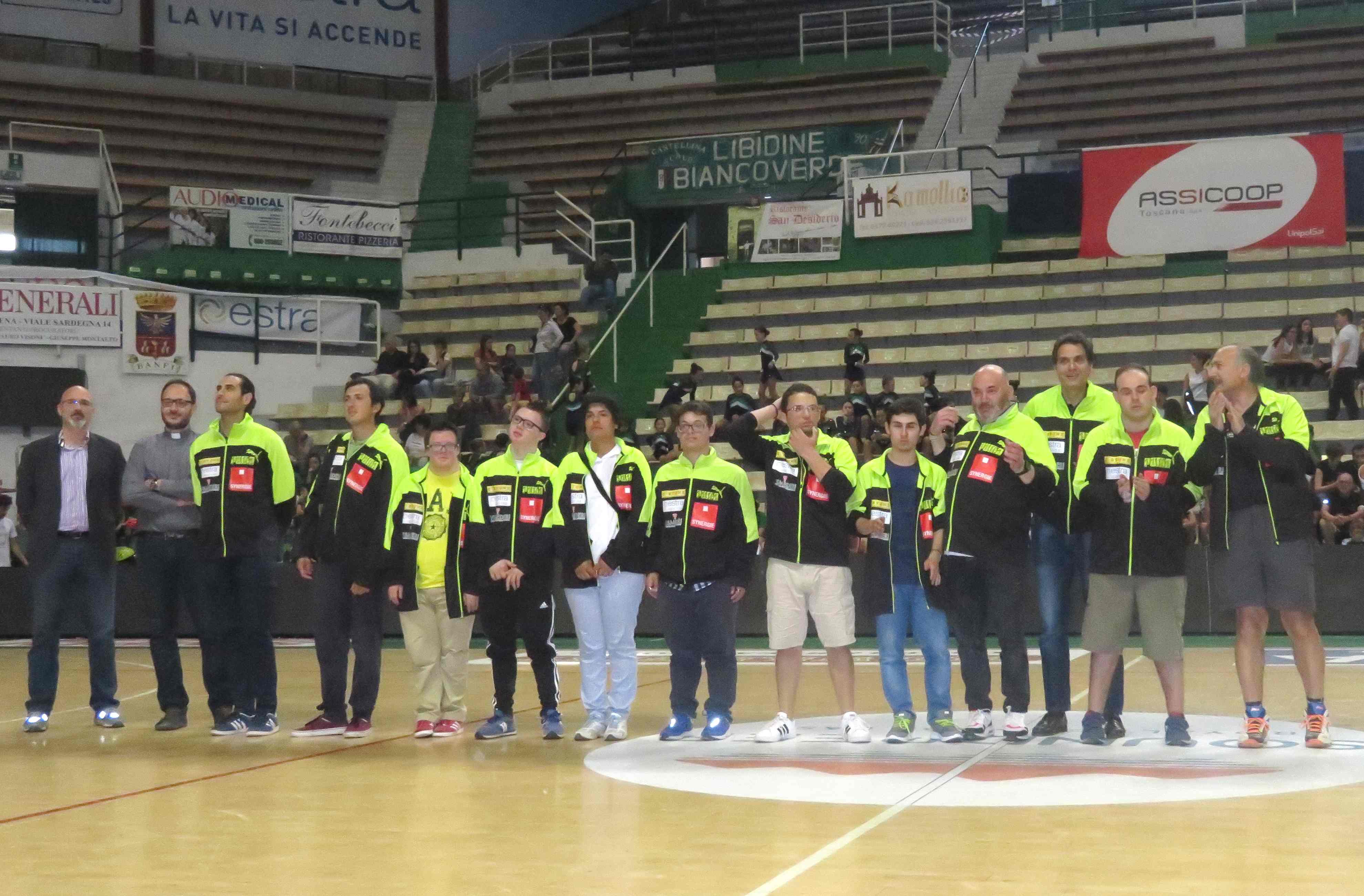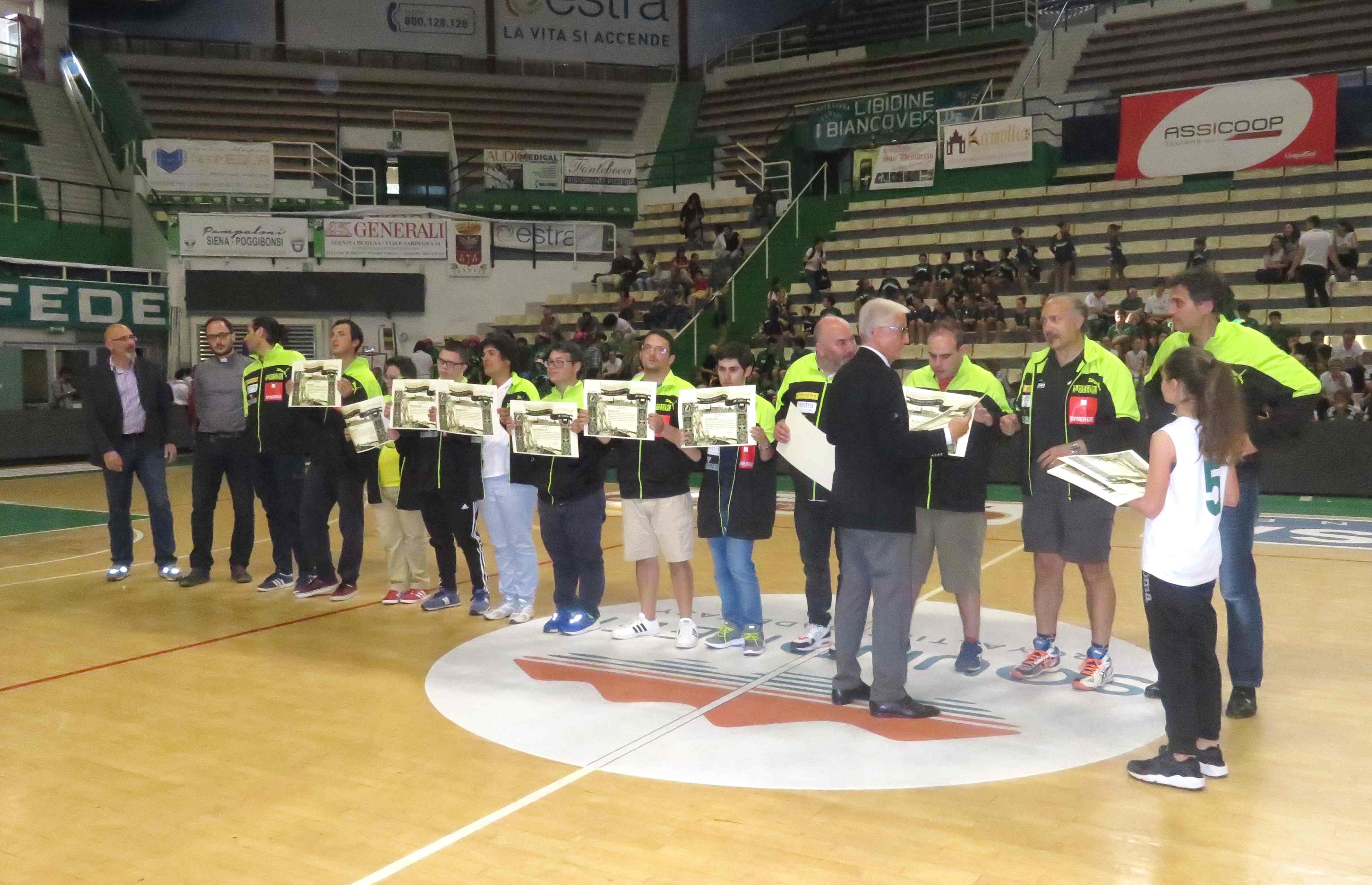 Una cornice fantastica di pubblico e atleti ha accompagnato e salutato in campo la squadra della Synergie Estra Costone Baskin in occasione della festa di chiusura dei corsi della Polisportiva Mens Sana che si è tenuta lunedì pomeriggio al PalaEstra. Al gruppo di Giuseppe Dragone è stato consegnato un attestato di riconoscenza per l’attività svolta. Ancora una grande emozione per tutti!