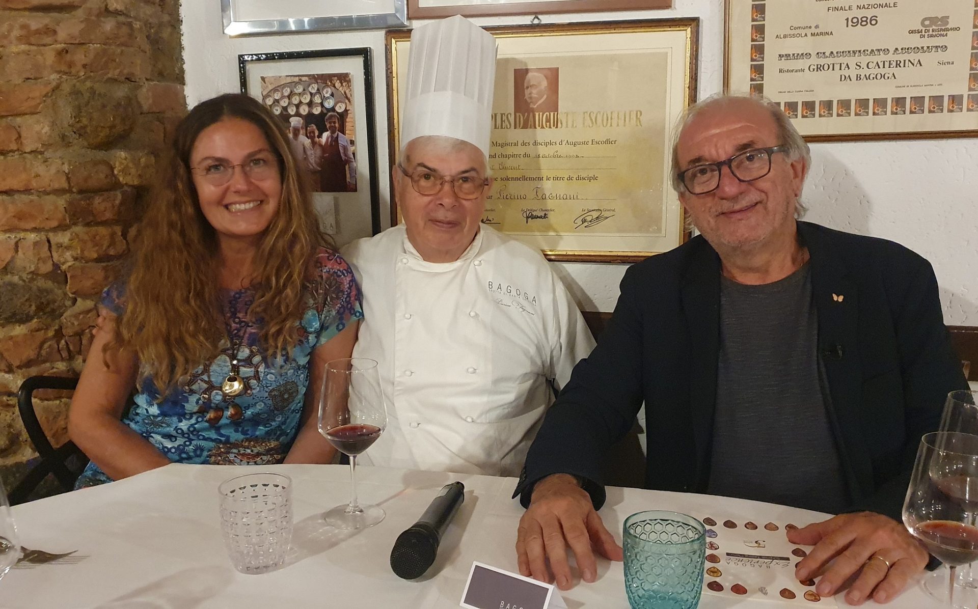 Pierino Fagnani, in arte Bagoga, adesso alza il mestolo in segno di vittoria, ha tutto il diritto per farlo, ma una volta brandiva il nerbo. La sua carriera come fantino del Palio di Siena però non è stata lunga come quella di cuoco, tutt’altro. Qualche prova, un Palio non corso per infortunio al cavallo del Drago (agosto 1968), e un Palio corso nella Civetta (luglio 1970), dove al primo Casato assaggiò il tufo. La moglie Maria Pia Gambelli, che faceva la parrucchiera, lo convinse a smettere, convincendolo che il suo destino non sarebbe stato in Piazza del Campo, bensì nella Grotta di Santa Caterina. Così fu e così è. Dopo 50 anni Bagoga è uno dei ristoranti più rinomati, vengono da tutte le parti del mondo, soprattutto dal Giappone, per gustare la cucina tipica delle nostre terre e gli spaghetti al cartoccio, uno dei suoi cavalli, pardon, piatti di battaglia. Montalcinese di nascita, senese di adozione (in casa sua son tutti dell’Aquila), ha saputo creare dal nulla una leggenda, grazie anche alla sua famiglia che opera all’interno del ristorante.