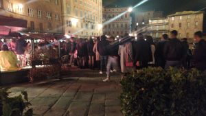 Sembra un sabato sera qualunque non appena si entra in Piazza del Campo, se non fosse per la grande presenza di forze dell’ordine davanti a Palazzo Pubblico. Dall’altra parte della Conchiglia, nonostante i bar chiudano le serrande e tolgano i tavolini a mezzanotte, la serata prosegue come se nulla fosse. Due vigili si fanno strada tra la folla limitandosi ad accertare l’utilizzo della mascherina. La percezione del pericolo contagio non è cambiata in città e neanche la stretta da parte del Governo ha alterato gli orari della movida. Mascherine alzate e nessun cocktail in mano ma la Piazza resta pur sempre piena. È sabato sera.