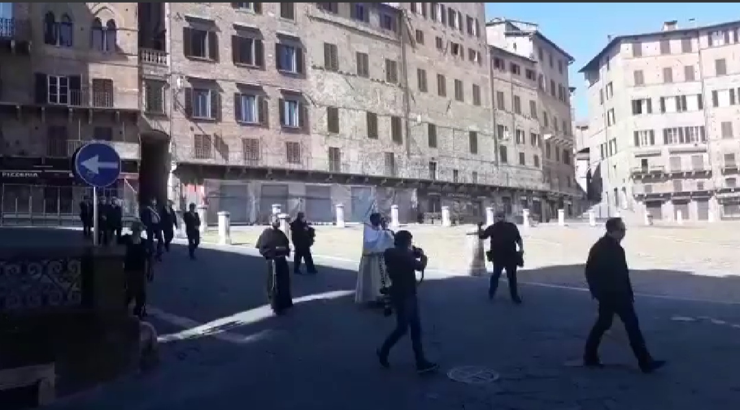 Una particolare celebrazione della Pasqua a Siena al tempo del coronavirus. L’Arcivescovo Augusto Lojudice, con il Santissimo Sacramento, dopo la benedizione in Duomo, ha attraversato in via straordinaria la città per riportare in San Francesco le sacre particole esposte per la venerazione del Miracolo Eucaristico, accompagnato dai frati e dalle autoritá cittadine.
