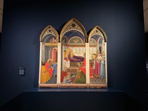 Artisti e opere. La pittura senese del XIV secolo rappresenta una delle pagine più straordinarie della storia dell’arte italiana. Artisti come Duccio di Buoninsegna, Simone Martini e i fratelli Pietro e Ambrogio Lorenzetti hanno contribuito a creare uno stile unico, caratterizzato da una profonda spiritualità, colori vivaci e dettagli raffinati. La mostra presenta opere di questi maestri, tra cui la Maestà di Duccio (la mostra riunisce alcuni pannelli originariamente appartenenti a questa monumentale pala d’altare, offrendo una rara opportunità di vederli nuovamente insieme dopo secoli di separazione), il Polittico Orsini di Simone Martini (pannelli di questa straordinaria opera sono esposti insieme per la prima volta nella memoria contemporanea, mettendo in luce l’uso raffinato del colore e dell’oro da parte di Martini), l’Annunciazione di Ambrogio Lorenzetti (proveniente dalla Pinacoteca di Siena), la Natività della Vergine di Pietro Lorenzetti (una rappresentazione intima e dettagliata della nascita di Maria, con una grande attenzione alla resa degli ambienti domestici).