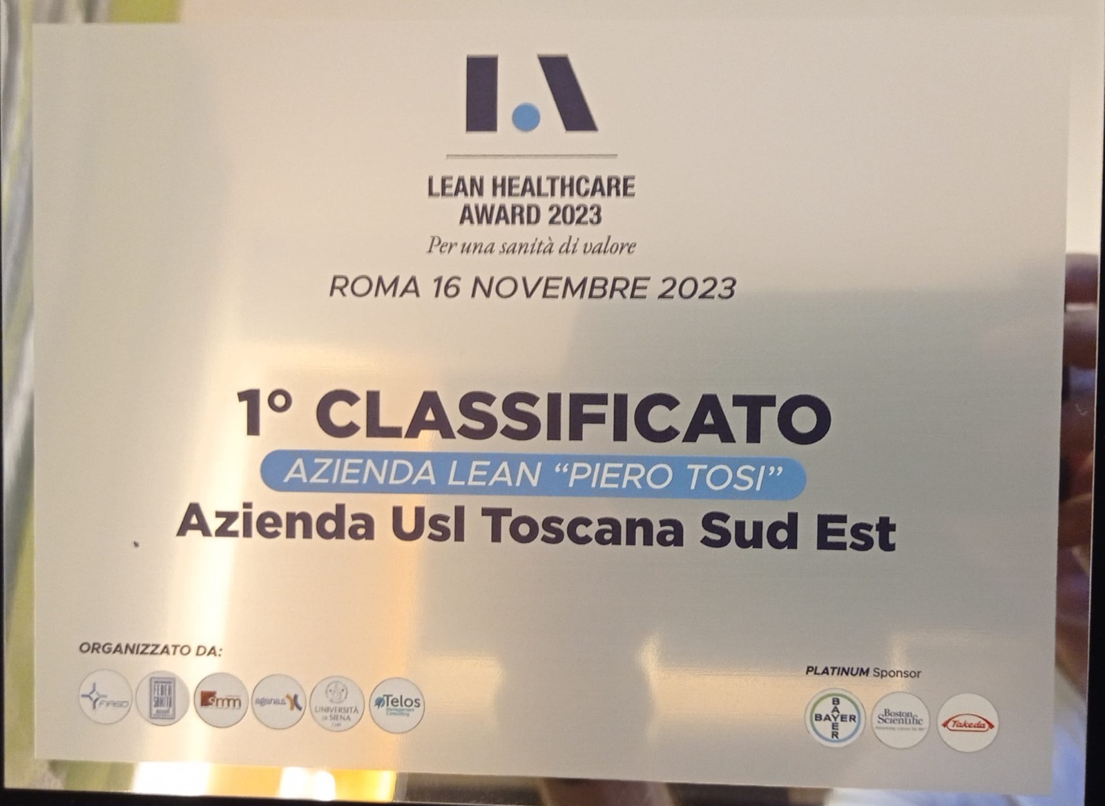 “Tutti i premi sono graditi e importanti, – dichiara il direttore generale Asl Toscana sud est Antonio D’Urso, – ma senza dubbio il vero riconoscimento al quale vorrei dare risalto è quello di miglior azienda sanitaria Lean d’Italia. Quando parliamo di “cultura Lean” ci si riferisce a quell’insieme di valori culturali, principi professionali e metodiche organizzative che puntano a semplificare ed ottimizzare i processi, diminuendo gli sprechi e migliorando le organizzazioni ed i servizi per i pazienti. Questi temi sono le “stelle polari” del nostro agire. Tra 92 aziende sanitarie italiane che hanno partecipato al Lean Award la nostra Asl è risultata vincente con un approccio innovativo nel miglioramento della qualità dei servizi, questo ci rende orgogliosi e ci da grande responsabilità rispetto ai nostri obiettivi ed al percorso che stiamo percorrendo per garantire a tutti i massimi livelli di assistenza. È stato riconosciuto il nostro approccio manageriale con procedure e strumenti volti alla comprensione di ciò che il paziente ritiene importante, questo ci ha consentito di riorientare tutti i processi organizzativi avendo sempre come obiettivo il benessere della comunità. Questo premio, che ho avuto l’onore di ricevere, – conclude il direttore generale D’Urso, – è il risultato di un lavoro di squadra eccezionale che coinvolge tutto il sistema Asl Toscana sud est, per cui colgo l’occasione per condividerlo con tutti: medici, infermieri, amministrativi, tecnici, coloro che lavorano sul territorio e quelli impegnati negli ospedali. Insomma credo che tutti dobbiamo essere orgogliosi di questo riconoscimento”.