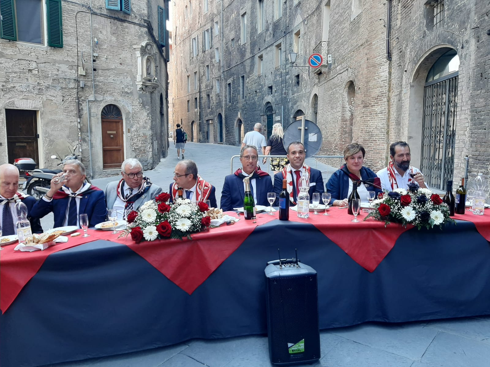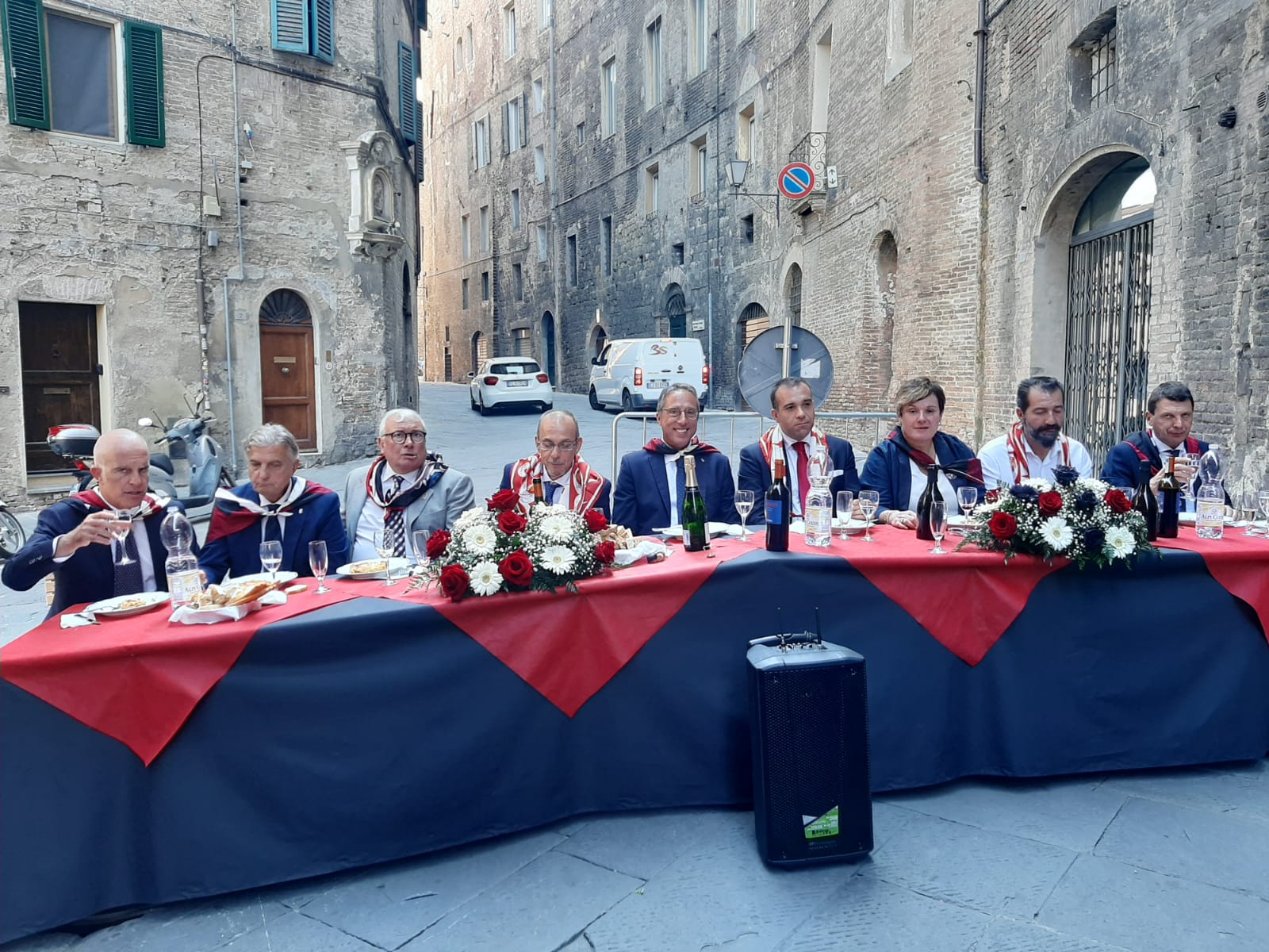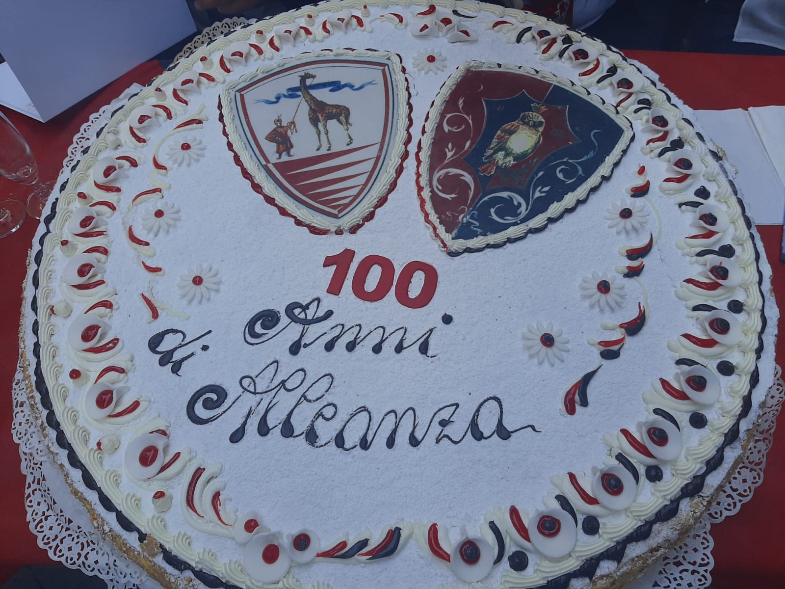 Le contrade di Civetta e Giraffa hanno festeggiato oggi insieme a pranzo i 100 anni dalla nascita dell’alleanza tra le due consorelle. Un’alleanza datata 1923: dopo le sbandierate congiute nei due territori, in Piazza Tolomei e Provenzano, i due popoli si sono ritrovati in via Sallustio Bandini per il pranzo congiunto alla presenza dei rispettivi contradaioli e dirigenze, nel corso del quale è stata servita anche una torta celebrativa.