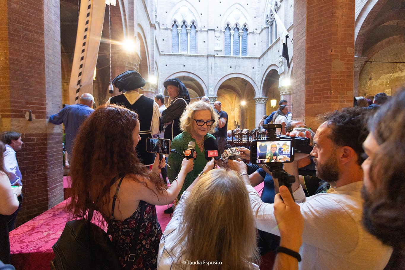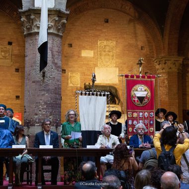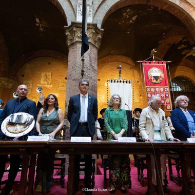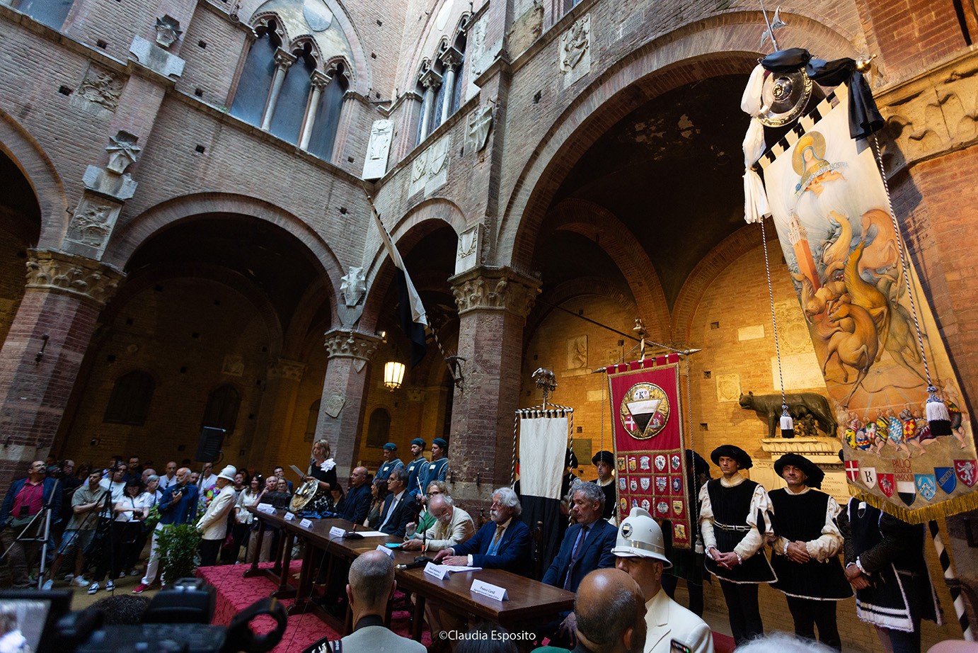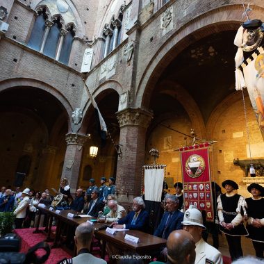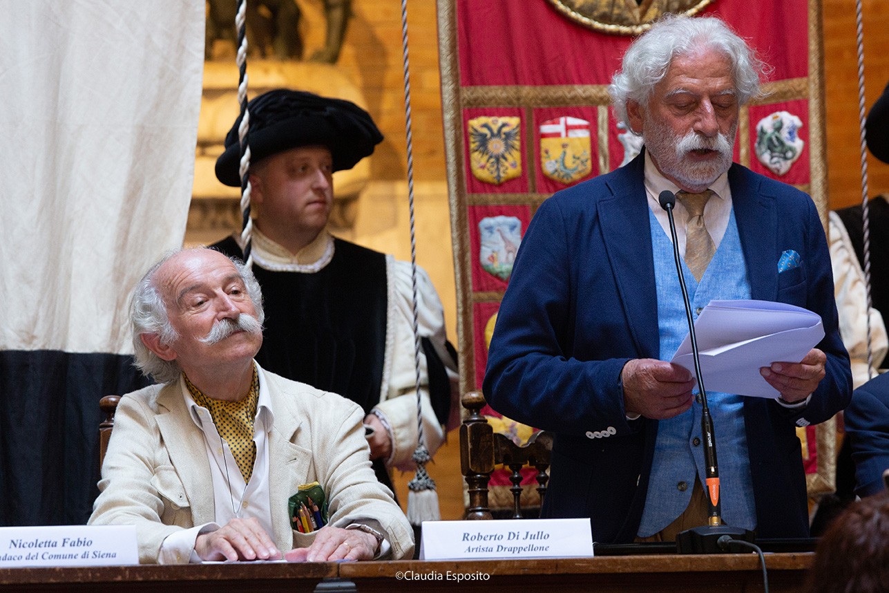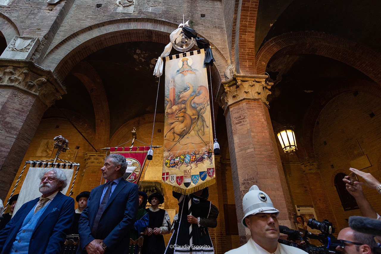 Riviviamo le emozioni della presentazione del drappellone realizzato dall’artista Roberto di Jullo per il Palio del 2 luglio, con le immagini scattate da Claudia Esposito per Siena Tv. Applausi per l’opera che è stata svelata ieri sera nel cortile del Podestà di Palazzo Pubblico.