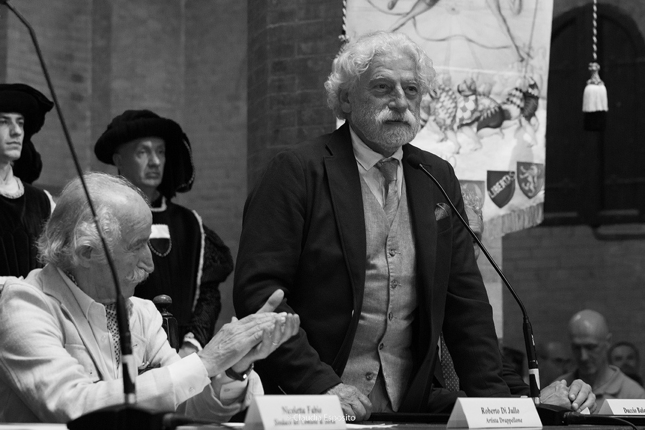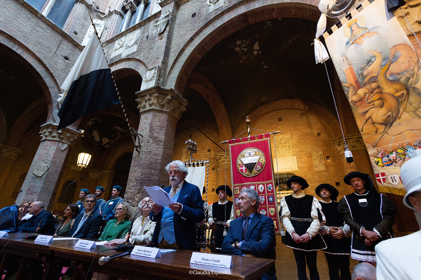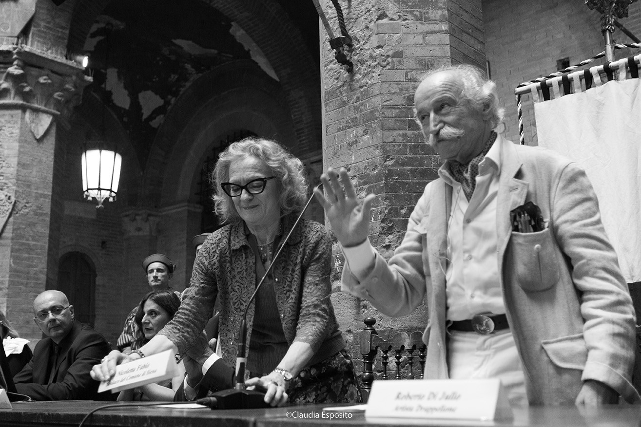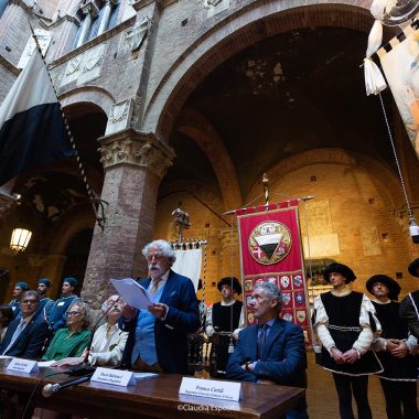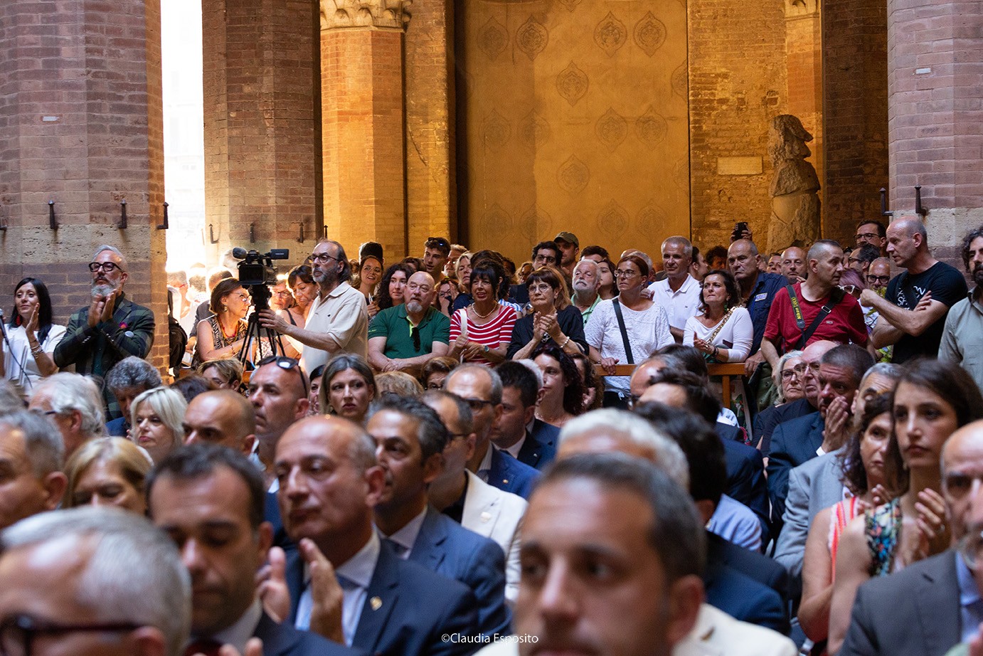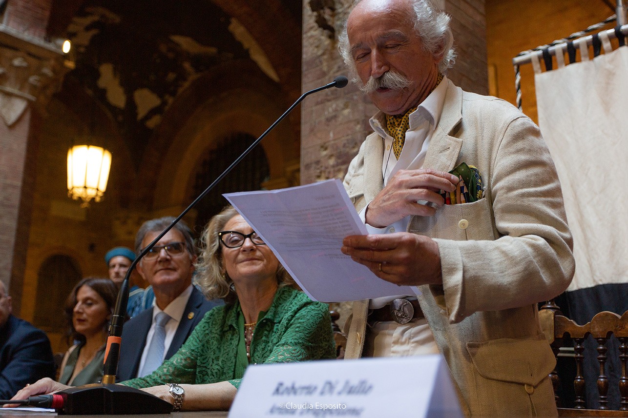 Riviviamo le emozioni della presentazione del drappellone realizzato dall’artista Roberto di Jullo per il Palio del 2 luglio, con le immagini scattate da Claudia Esposito per Siena Tv. Applausi per l’opera che è stata svelata ieri sera nel cortile del Podestà di Palazzo Pubblico.