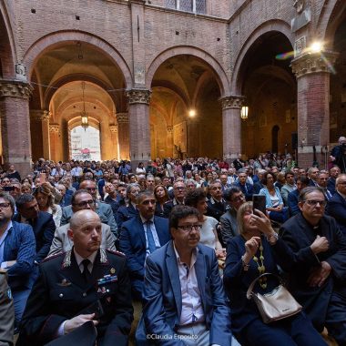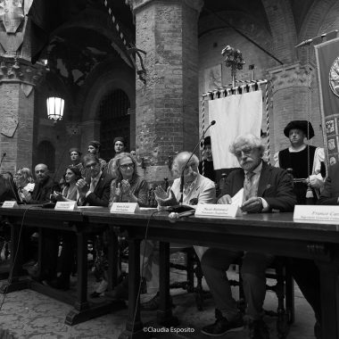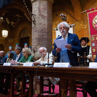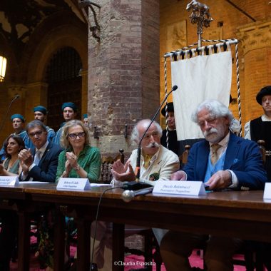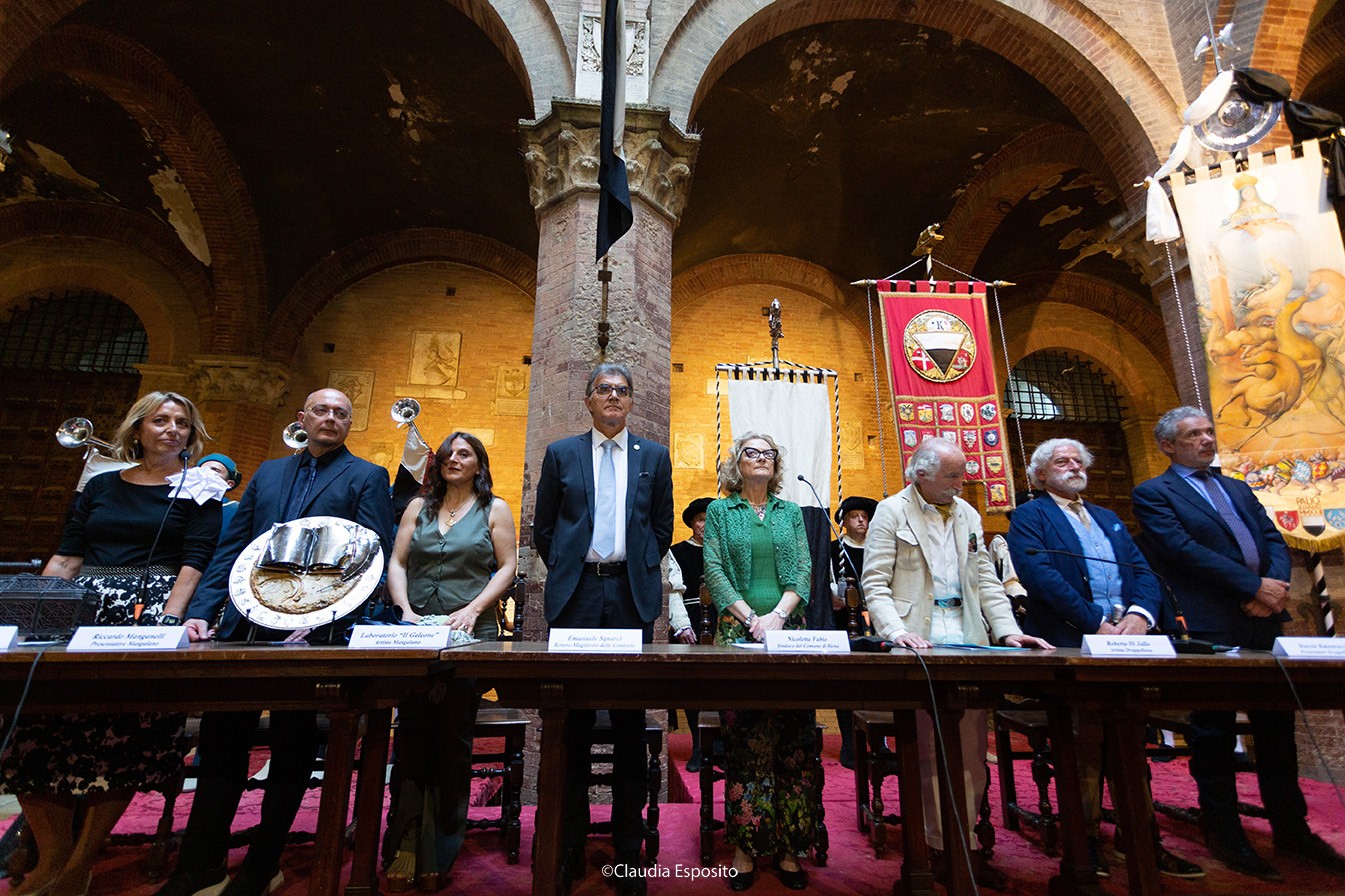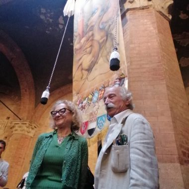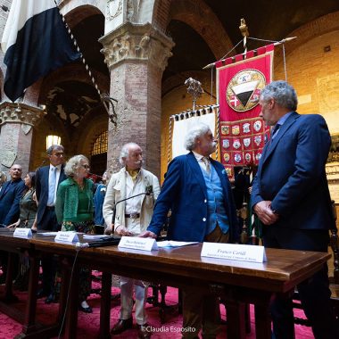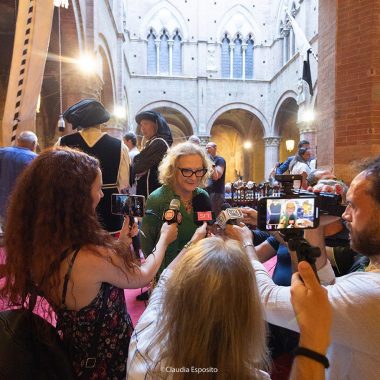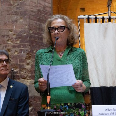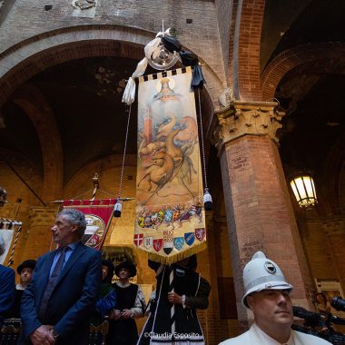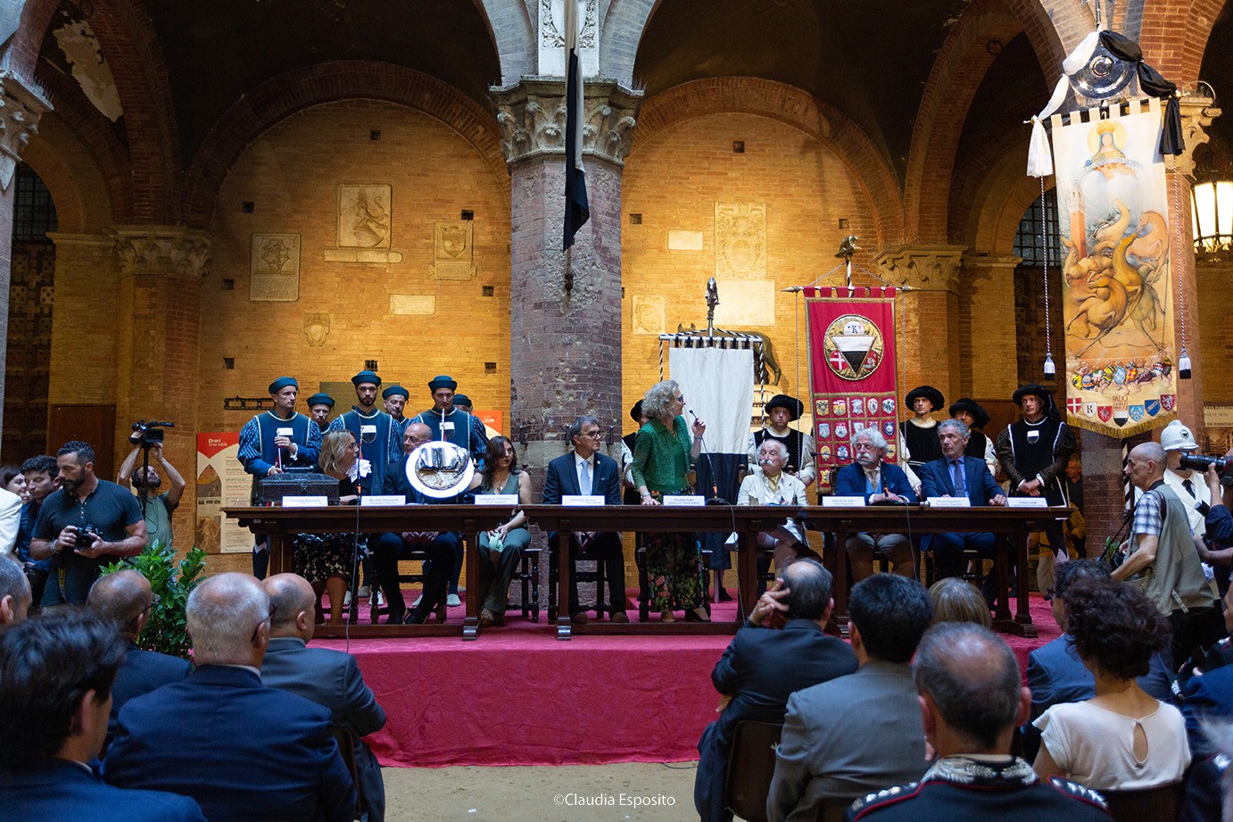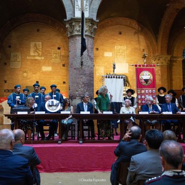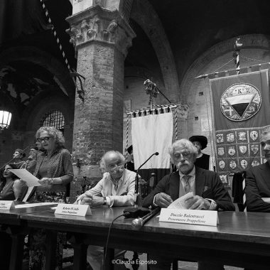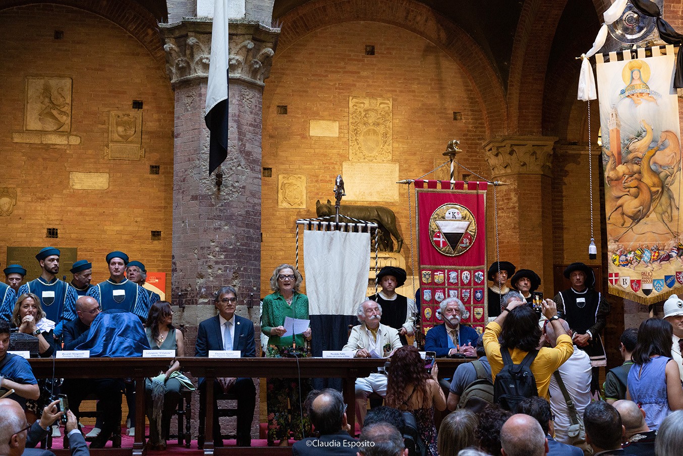 Riviviamo le emozioni della presentazione del drappellone realizzato dall’artista Roberto di Jullo per il Palio del 2 luglio, con le immagini scattate da Claudia Esposito per Siena Tv. Applausi per l’opera che è stata svelata ieri sera nel cortile del Podestà di Palazzo Pubblico.