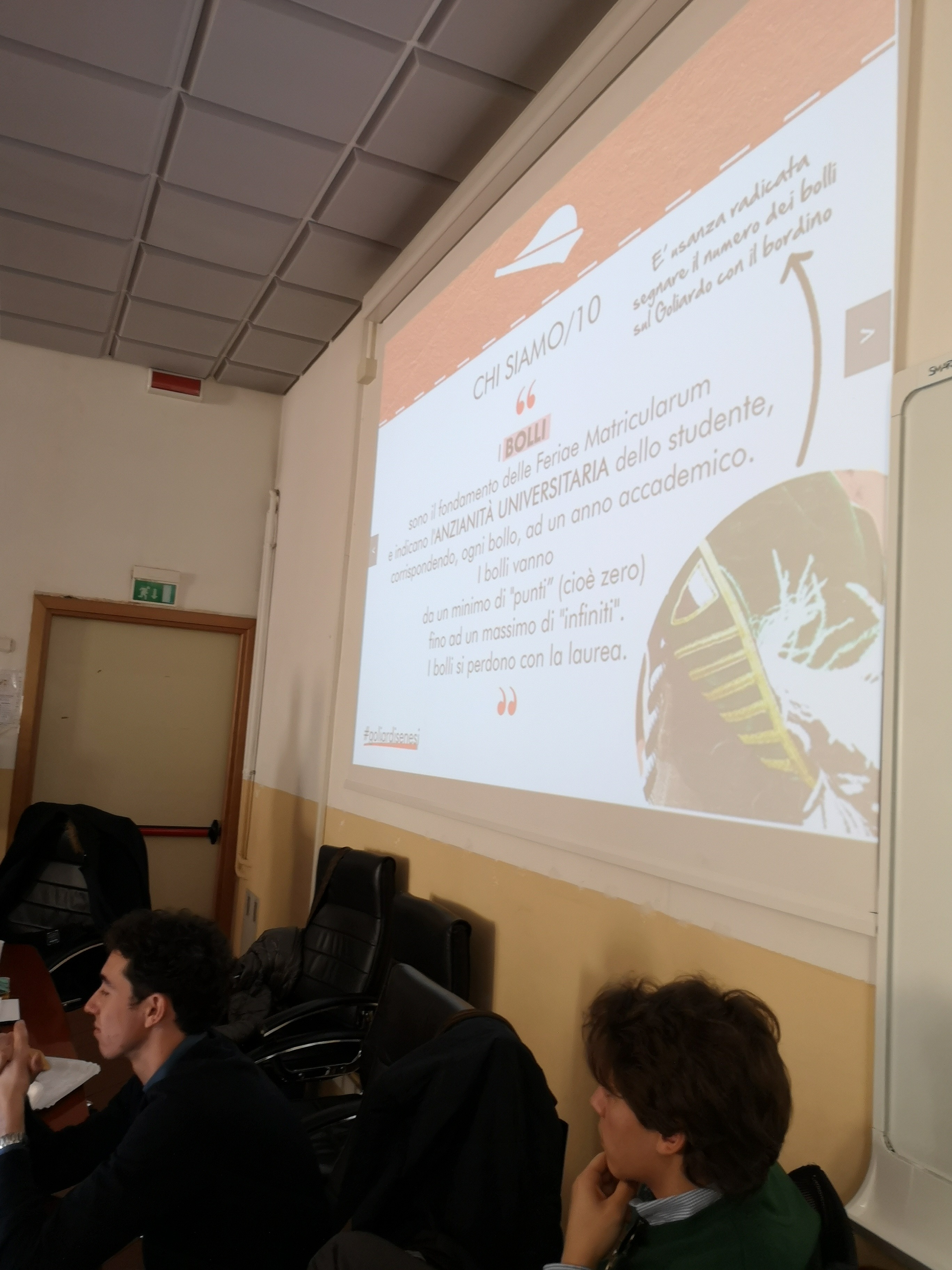 Al centro dell’attenzione, il mondo delle Feriae Matricularum, le attività che da anni caratterizzano la goliardia senese e naturalmente l’immancabile operetta di cui sono stati proiettati alcuni spezzoni in aula.