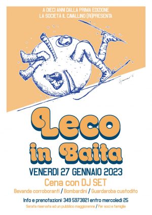 Venerdì 27 gennaio, a dieci anni dalla prima edizione, la Società Il Cavallino (ri)presenta il “Leco in Baita“, cena con DJ set. E’ possibile prenotarsi specificando nome, cognome e le eventuali allergie e/o intolleranze mediante l’apposita app entro e non oltre mercoledì 25 gennaio. Per info contattare Francesco De Jorio (349 597 3821). Per soci e famiglie.
