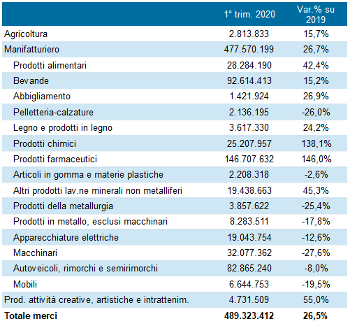 Nel primo trimestre 2020 il valore complessivo delle esportazioni della provincia di Siena è cresciuto complessivamente di oltre 102 milioni di euro (+26,5% in termini percentuali) rispetto allo stesso periodo del 2019, attestandosi a oltre 489 milioni di euro. Il saldo commerciale presenta un avanzo di oltre 350 milioni di euro.