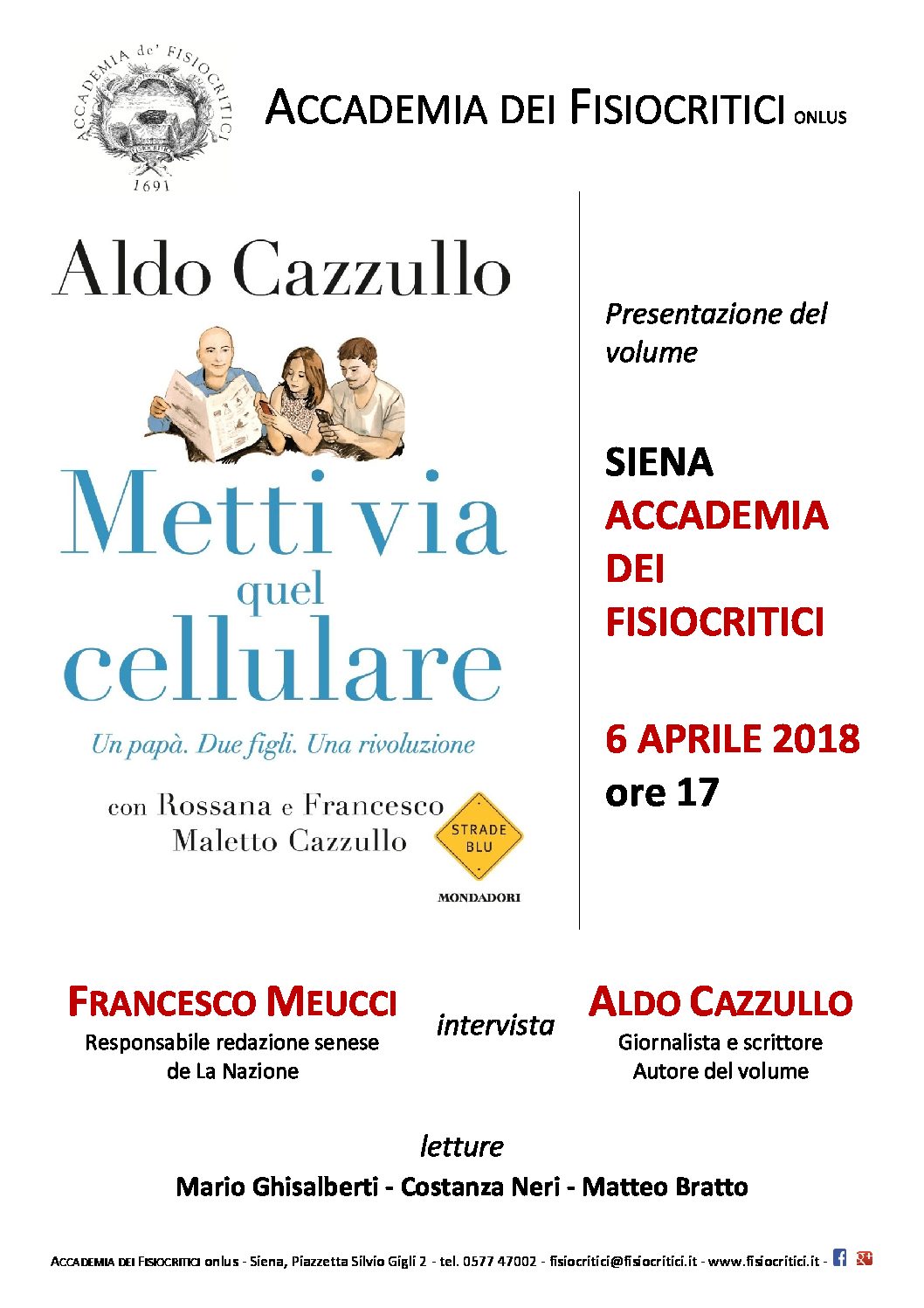 E’ prevista per venerdì 6 aprile 2018 alle ore 17 presso l’Accademia dei Fisiocritici la presentazione del libro del giornalista Aldo Cazzullo “Metti via quel cellulare. Un padre. Due figli. Una rivoluzione”. Cazzullo, inviato ed editorialista del «Corriere della Sera», oltre ad aver scritto questo volume ha già pubblicato dieci saggi sulla storia e l’identità italiana.
