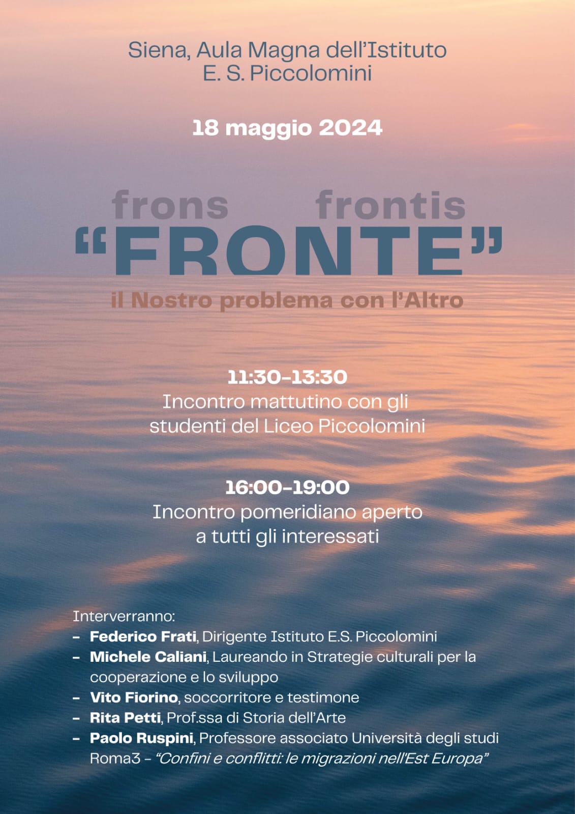 Frōns, frŏntis – “Fronte”. Il nostro problema con l’Altro, è il titolo dell’evento in programma sabato prossimo 18 maggio al Liceo Enea Piccolomini di Siena curato e ideato da Michele Caliani, ex studente del Liceo e oggi laureando in Strategie Culturali per la Cooperazione e lo Sviluppo a Roma Tre. Un doppio appuntamento, la mattina rivolto agli studenti e il pomeriggio aperto a tutta la cittadinanza, per parlare di linee di confine, dell’altro, della diversità partendo da un fatto di cronaca terribile: quello del naufragio di Lampedusa del 3 ottobre 2013.