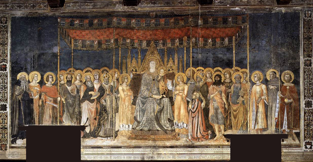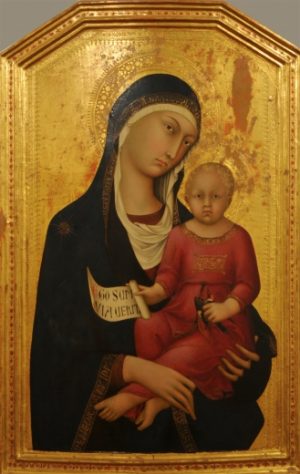 Tra i migliori pittori senesi, e non solo, del XIV secolo, il più valido collaboratore di Simone Martini, Lippo Memmi fu molto apprezzato. Numerosi i suoi dipinti raffiguranti la ‘Madonna col Bambino’ a mezza figura: sostenuta da una straordinaria e originale finitezza, esprime l’arte intima e aristocratica dell’artista. Inizialmente lavorò a San Gimignano. La sua prima realizzazione certa è il grande affresco della ‘Maestà’ nel Salone del Palazzo Pubblico (1317); l’opera è ispirata alla ‘Maestà’ di Simone nel Palazzo Pubblico di Siena, anche se con una minore intensità di espressione, un colore meno limpido e una linea diversa. Nel 1324, Simone Martini si sposò con Giovanna, sorella di Lippo Memmi. Fu l’occasione per rafforzare il sodalizio familiare e artistico fra i due pittori. La ‘Madonna del Popolo’ della Chiesa dei Servi, risalente alla seconda metà degli anni venti del Trecento, rappresenta uno dei vertici dell’arte di Lippo Memmi. Nel 1333 i due cognati licenziarono la bellissima tavola della ‘Annunciazione’ attualmente agli Uffizi.