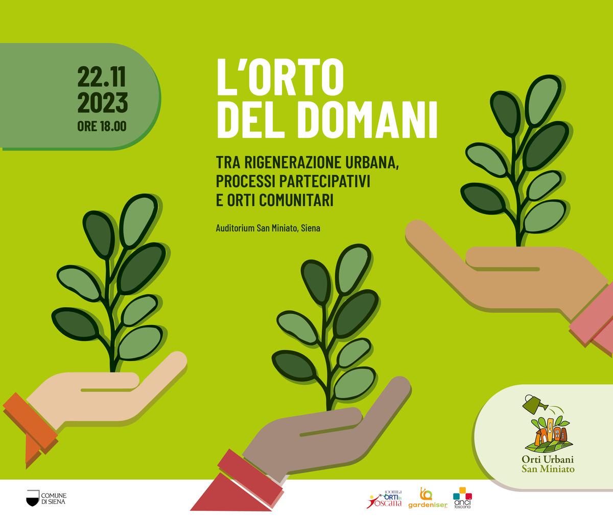 L’imminente inizio dei lavori relativi agli “Orti Urbani San Miniato”, progetto finanziato dal Comune di Siena e dalla Regione Toscana nell’ambito dell’iniziativa regionale “100Mila Orti in Toscana”, diventa un’opportunità per un incontro e focus sugli “orti comunitari” come strumento di rigenerazione urbana, cura dei beni comuni e coinvolgimento degli attori locali nella sfida di creare comunità inclusive, coese e capaci di cooperare per la co-gestione e co-progettazione dello spazio urbano. L’incontro pubblico, dal titolo “L’orto del domani tra rigenerazione urbana, processi partecipativi e orti comunitari” è in programma oggi pomeriggio alle ore 18 presso l’auditorium di San Miniato.