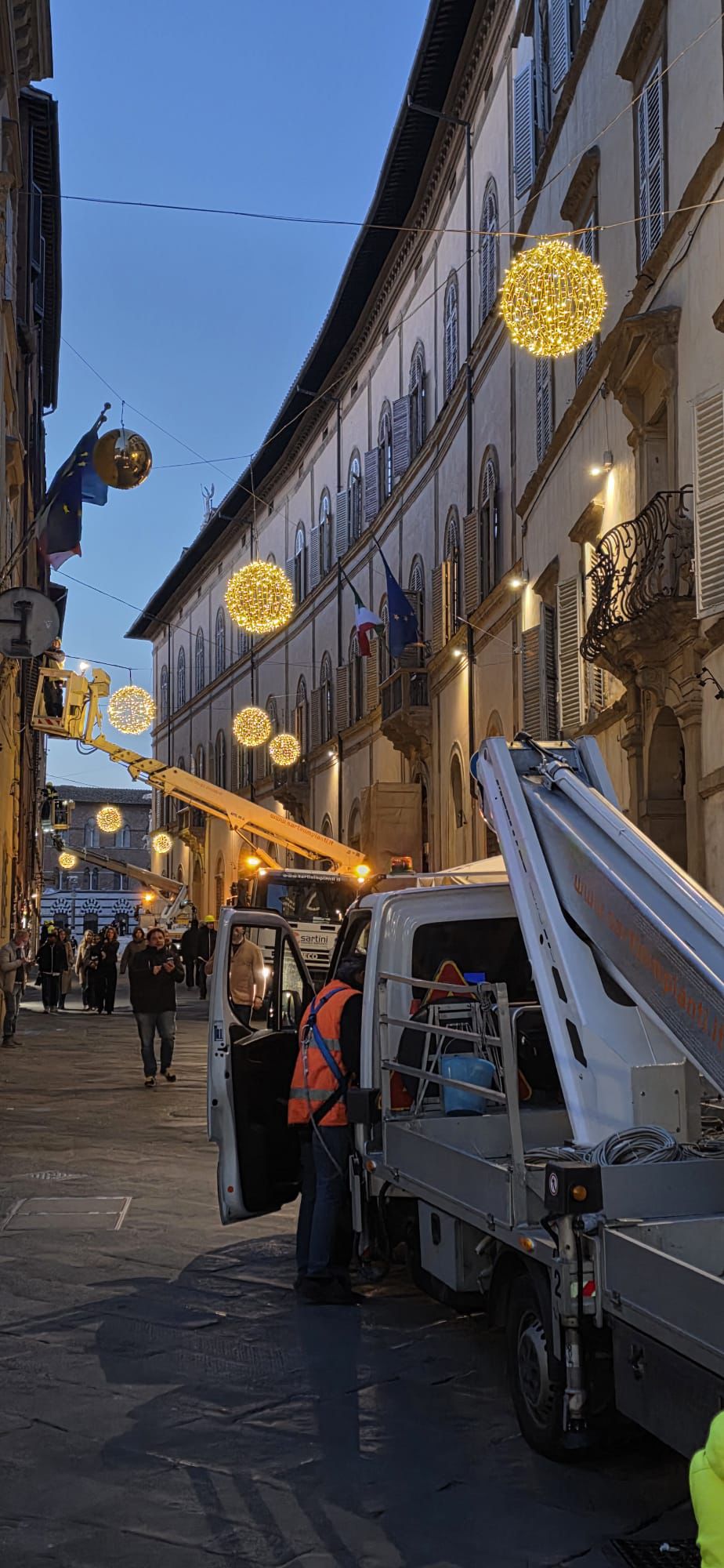 L’atmosfera è già quella delle feste: anche il Corso ha iniziato a prendere vita con i primi allestimenti, mentre il grande albero e le decorazioni principali saranno posizionate nei prossimi giorni davanti alla Cattedrale e al Santa Maria della Scala. Non solo: le Logge del Papa e quelle della Mercanzia saranno impreziosite da effetti luminescenti pensati per esaltare l’architettura dei luoghi simbolo del centro.