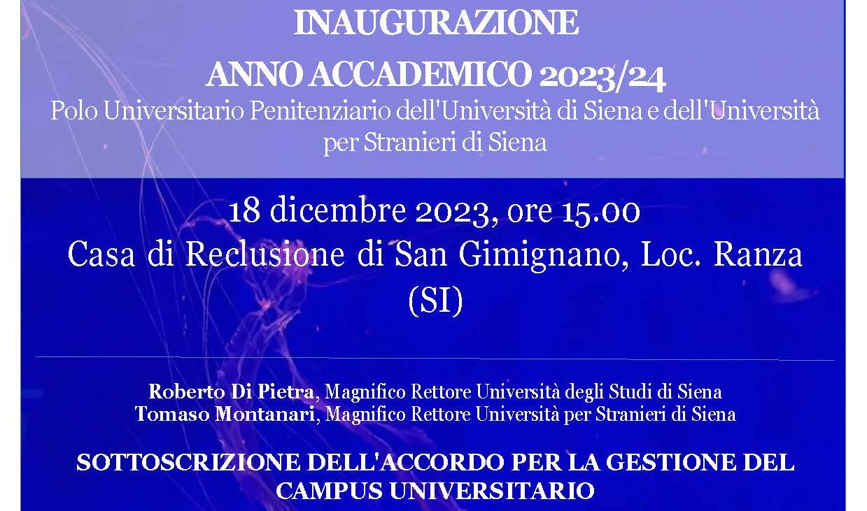 Una ricca serie di eventi farà da cornice alla inaugurazione delle attività dell’Anno Accademico del Polo Universitario Penitenziario dell’Università di Siena e dell’Università per Stranieri di Siena, che si terrà il prossimo 18 dicembre presso la Casa di Reclusione di San Gimignano, in località Ranza (Si).