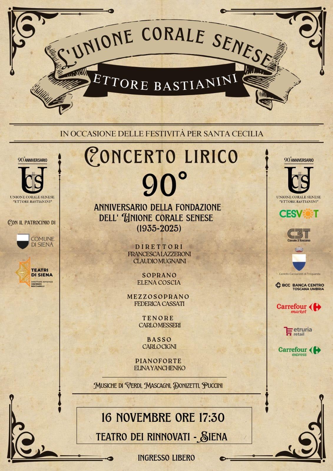 Domenica 16 novembre, al Teatro dei Rinnovati, alle ore 17,30, con il patrocinio del Comune e dei Teatri di Siena, l’Unione Corale Senese ‘Ettore Bastianini’ conclude le celebrazioni per i novant’anni della sua costituzione, con un concerto lirico nella tradizione.