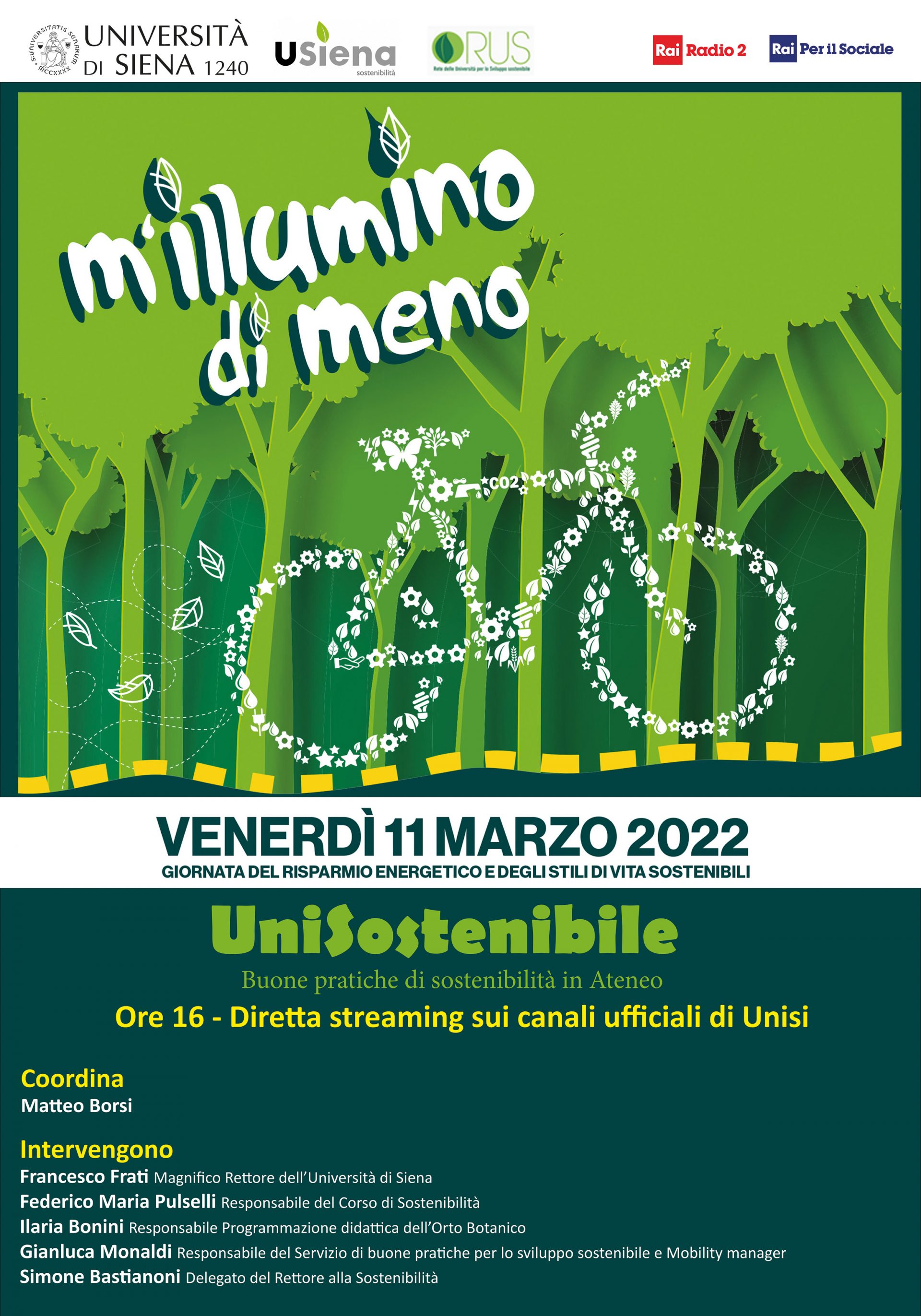 L’Università di Siena partecipa all’edizione 2022 di “M’illumino di meno”, la giornata del risparmio energetico e degli stili di vita sostenibili promossa dal programma di Rai Radio2 Caterpillar, che quest’anno si tiene oggi, 11 marzo, con un incontro on line dal titolo “UniSostenibile. Buone pratiche di Sostenibilità in Ateneo”.