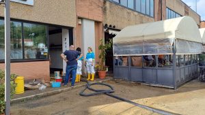 I commercianti di Massetana Romana adesso devono fare i conti con la devastazione causata dal maltempo che ha messo in ginocchio Siena questa notte. Non è ancora possibile fare il calcolo dei danni, ma intanto da stamani, in una delle zone più colpite dal nubifragio, tutti si sono rimboccati le maniche, i dipendenti, i titolari, i familiari, aiutati dalla Protezione Civile, la Misericordia di Siena e i Vigili del Fuoco. Tutti insieme hanno cercato di togliere il fango dalle tante attività allagate. A testa bassa, con muletti, pompe d’acqua, pale e scope per sgomberare tutti i negozi dalla melma. I più colpiti Bonucci Boulangerie, Acqua e Sapone, Petreni abbigliamento, Bio Bottega, L’Angolo del Caffè, Brico io.