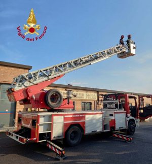 Nelle immagini l’intervento con autoscala per la copertura di un edificio industriale in località Strada della Tressa nel comune di Siena.