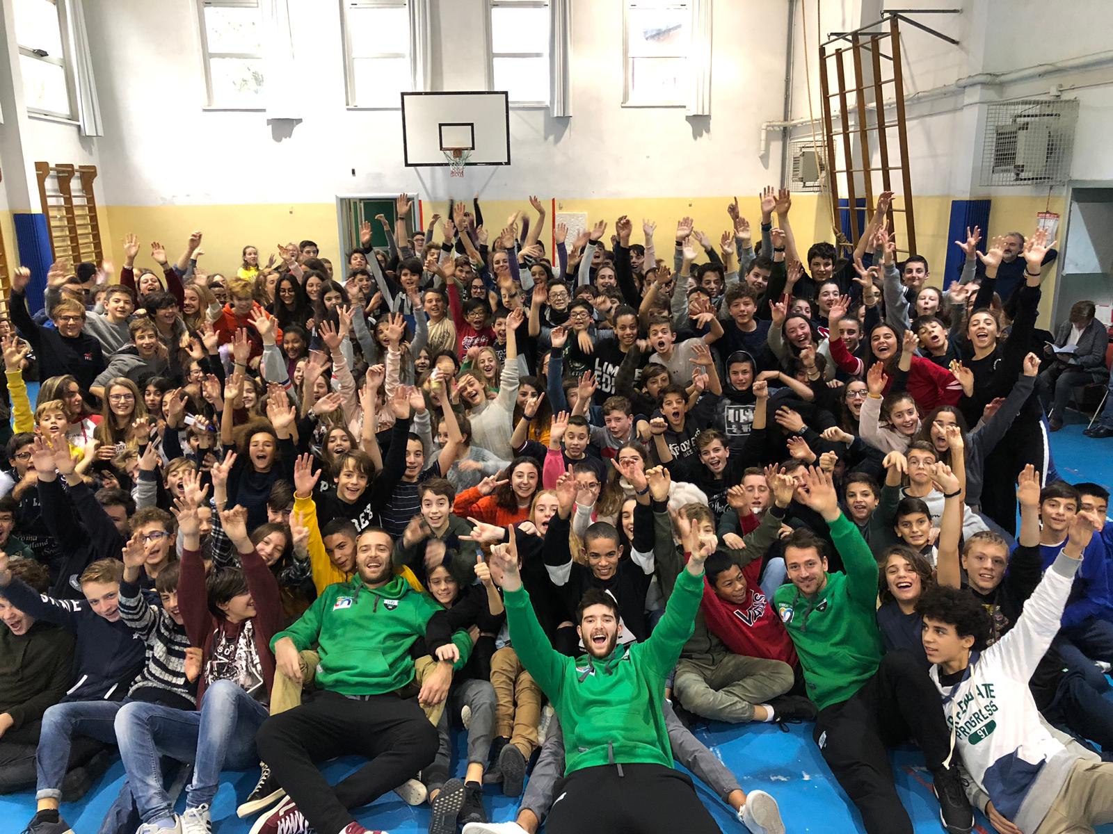 All’interno della palestra dell’istituto, dalle 11:00 alle 13:00, i circa 450 alunni della scuola secondaria di secondo grado coinvolti nell’iniziativa hanno potuto conoscere da vicino il capitano biancoverde Tommaso Marino, Carlos Morais, Roberto Prandin, Giacomo Sanguinetti, Alex Ranuzzi e Todor Radonjic ai quali hanno dapprima rivolto domande sul basket e sulla loro carriera. In seguito, capitanati dai giocatori biancoverdi, tre ragazzi in rappresentanza di ciascuna delle 20 classi partecipanti si son sfidati in una gara di tiro a cui sono seguite foto e autografi.