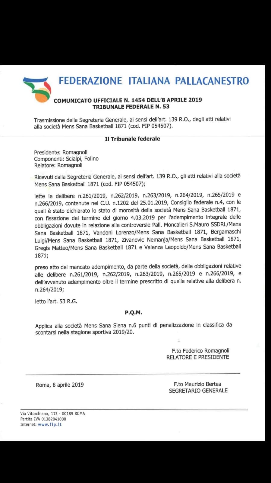 Nuova mazzata sulla Mens Sana: dopo l’esclusione dalla A2, il tribunale Fip ha inflitto 6 nuovi punti di penalità da scontare nel campionato 2019-2020, a causa del mancato adempimento di varie situazioni di morosità nei confronti di società e tesserati. Ecco il dispositivo del giudice: