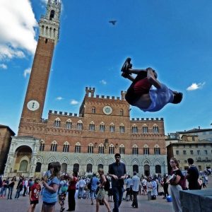 La Polisportiva Mens Sana 1871 ha un nuovo recordman biancoverde. L’atleta mensanino e maestro della Gym Mens Sana Parkour, infatti, ha conquistato il Guinness World Record eseguendo un salto mortale su una piattaforma, raggiungendo un’altezza di 1,07 metri. Mattia Corti, dopo essersi allenato duramente grazie anche al supporto tecnico di Matteo Fellini, della sezione fitness Mens Sana e David Betti, fisioterapista, è riuscito a superare di 7 centimetri il record del mondo precedentemente stabilito.