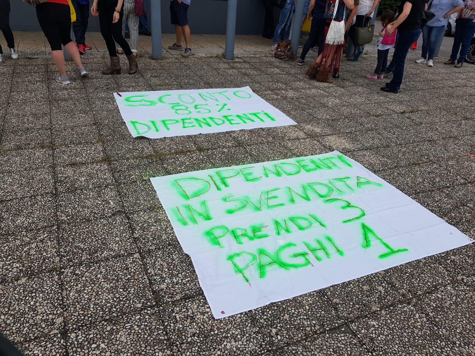 Per dare forza alla protesta, sono stati posti a terra degli striscioni con scritte eloquenti: “Dipendenti in svendita” “Sconto 85% dipendenti”.