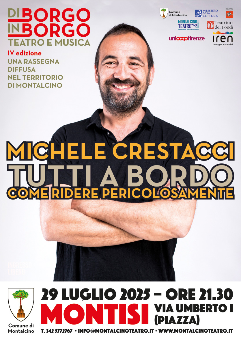 Si chiude con una serata all’insegna della comicità l’edizione 2025 di Di Borgo in Borgo – Teatro e Musica, la rassegna itinerante che ha animato per tutto il mese di luglio le piazze e i borghi del territorio di Montalcino. L’ultimo appuntamento è in programma martedì 29 luglio alle ore 21.30 a Montisi, in via Umberto I, con Michele Crestacci e il suo spettacolo “Tutti a bordo (come ridere pericolosamente)”.