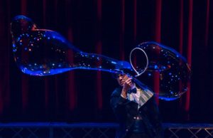 Spettacolo elegante e metaforico in cui protagoniste sono le bolle di sapone – tante bolle di sapone! – e la musica.