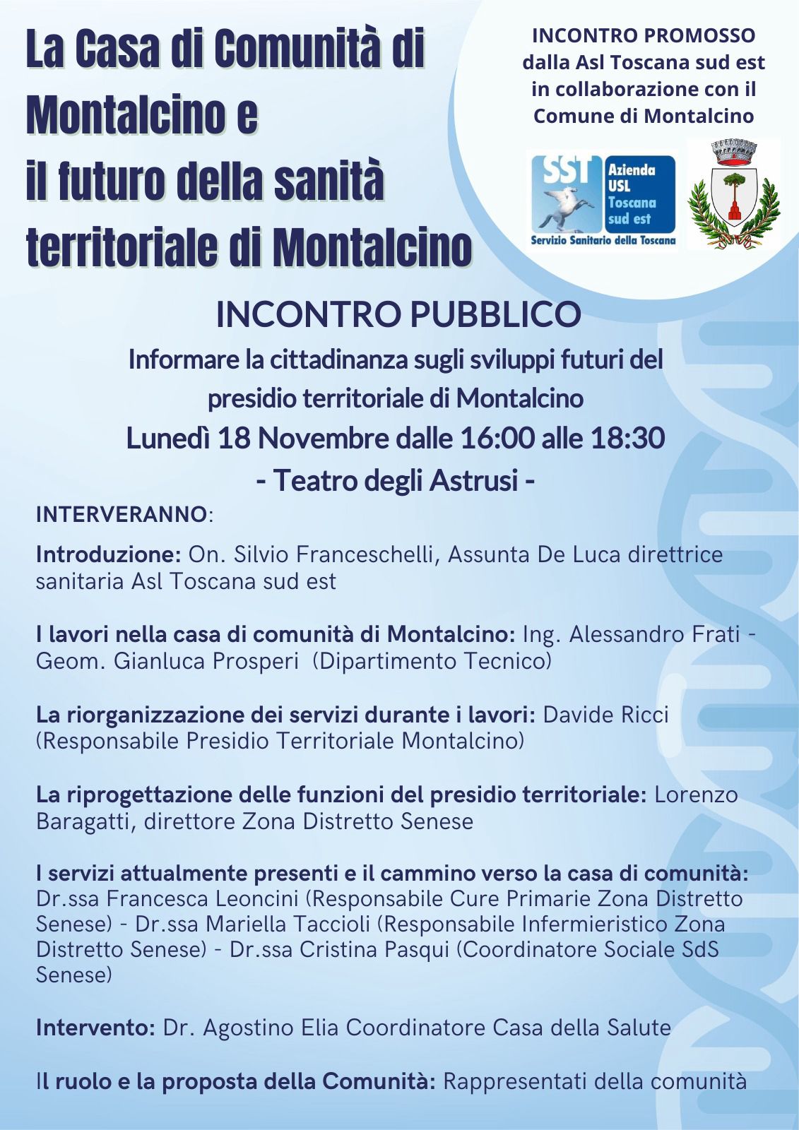 Informare la cittadinanza sugli sviluppi futuri del presidio territoriale di Montalcino. Con questo obiettivo si terrà l’iniziativa di domani, lunedì 18 novembre, a partire dalle ore 16 al Teatro degli Astrusi in via Costa del Municipio 10. L’incontro, promosso dalla Asl Toscana sud est in collaborazione con il Comune di Montalcino, è un tassello fondamentale nel coinvolgimento della comunità locale nel passaggio da Casa della Salute a Casa di comunità, affinché le attività della struttura assumano un valore non solo socio-sanitario ma anche comunitario.