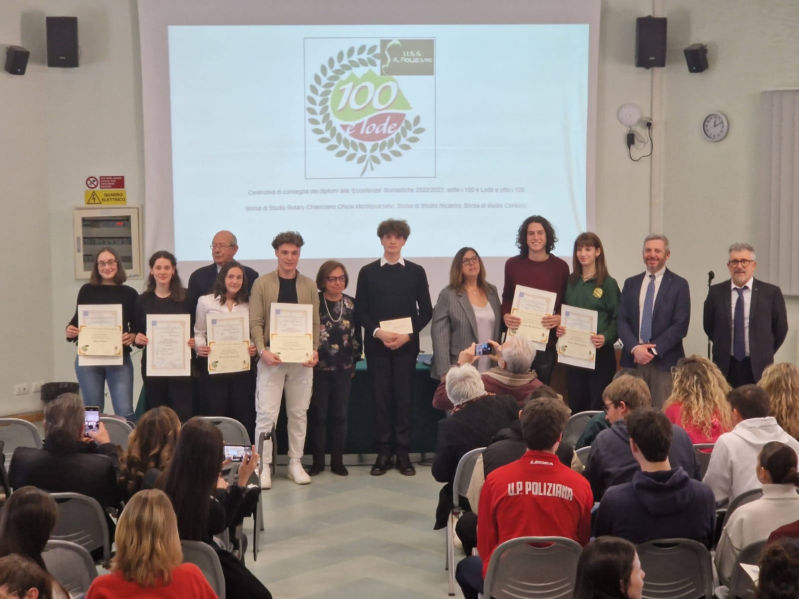 Una mattinata con tanta emozione è quella che si è svolta nell’aula magna dei Licei Poliziani per la cerimonia di consegna dei diplomi alle Eccellenze Scolastiche dell’anno scolastico 2022/2023, ovvero per gli studenti che si sono diplomati con 100 e Lode e 100. Durante la cerimonia sono state consegnate anche le borse di studio ‘Nicastro’, dedicata a Fernando Nicastro, storico libraio di Montepulciano, fortemente voluta dai suoi ex-compagni di classe dei Licei Poliziani e che prevede il conferimento allo studente più meritevole di un buono del valore 500 euro da utilizzare alla Libreria Centofiori; la borsa di studio ‘Contucci’ assegnata allo studente che ha primeggiato nelle discipline di Latino e Greco e infine la borsa di studio offerta dal Rotary Club Chianciano Chiusi Montepulciano andata agli studenti diplomati con 100 e Lode.