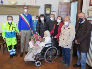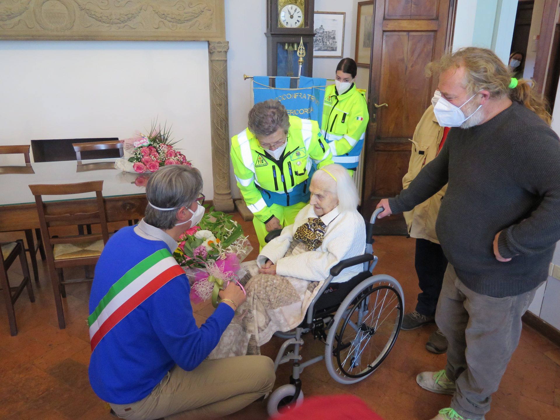 Ha passato indenne una guerra mondiale e la recente pandemia Covid. Per l’occasione il Sindaco le ha consegnato un mazzo di fiori e l’ha ricevuta nel suo studio, assieme agli operatori della stessa Misericordia, ad alcuni parenti e amici di Mafalda.