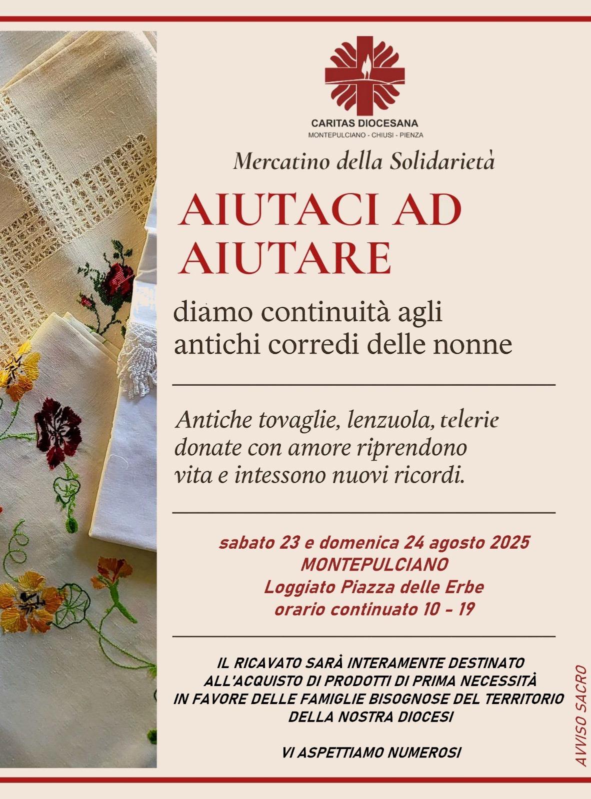 Si chiama “Aiutaci ad aiutare” il mercatino di solidarietà promosso dalla Caritas diocesana di Montepulciano-Chiusi-Pienza che si terrà il 23 e il 24 agosto 2025 dalle ore 10 alle ore 19 (orario continuato) presso il Loggiato di Piazza delle Erbe a Montepulciano. Lo slogan scelto quest’anno è “Diamo continuità agli antichi corredi delle nonne”.