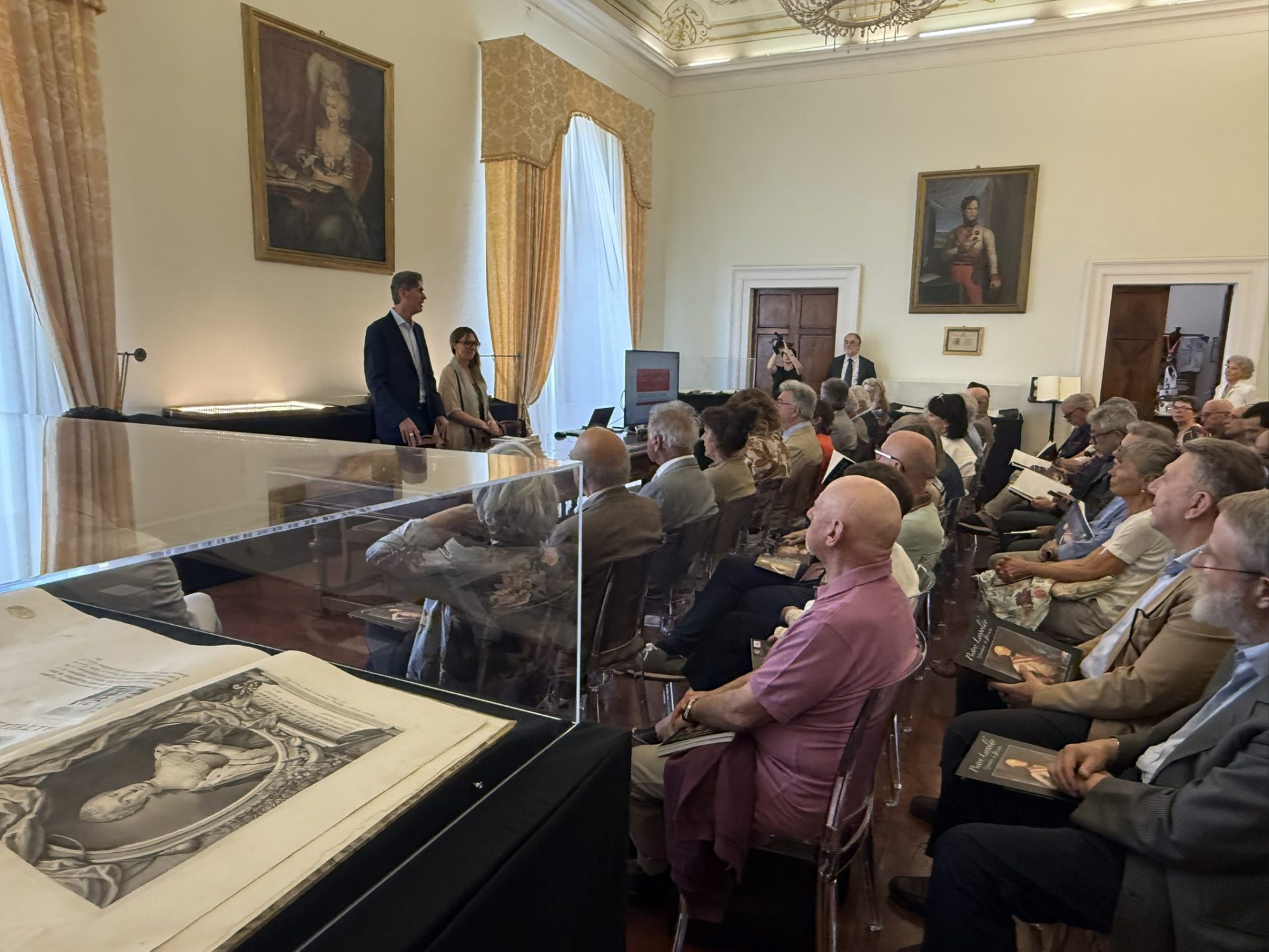 Alla presentazione della mostra hanno partecipato anche Giacomo Grazi per conto dell’Unione dei Comuni Valdichiana Senese, la Sindaca di Chianciano Terme Grazia Torelli, le consigliere regionali Anna Paris ed Elena Rosignoli, Marco Mosconi, preside dei Licei Poliziani, don Domenico Zafarana, per l’Istituto per la valorizzazione delle Abbazie Storiche della Toscana, Fausto Rossi per la Società Bibliografica Toscana, Samuele Lastrucci, direttore Museo de’ Medici – Firenze. Due gli interventi scientifici, quello di Patrizia La Porta, direttrice Museo Civico Pinacoteca Crociani che ha approfondito la storia dei dipinti della casa asburgica presente nel Palazzo Comunale e quello del prof. Giovanni Cipriani, dell’Università degli Studi di Firenze, sulla figura di Pietro Leopoldo.