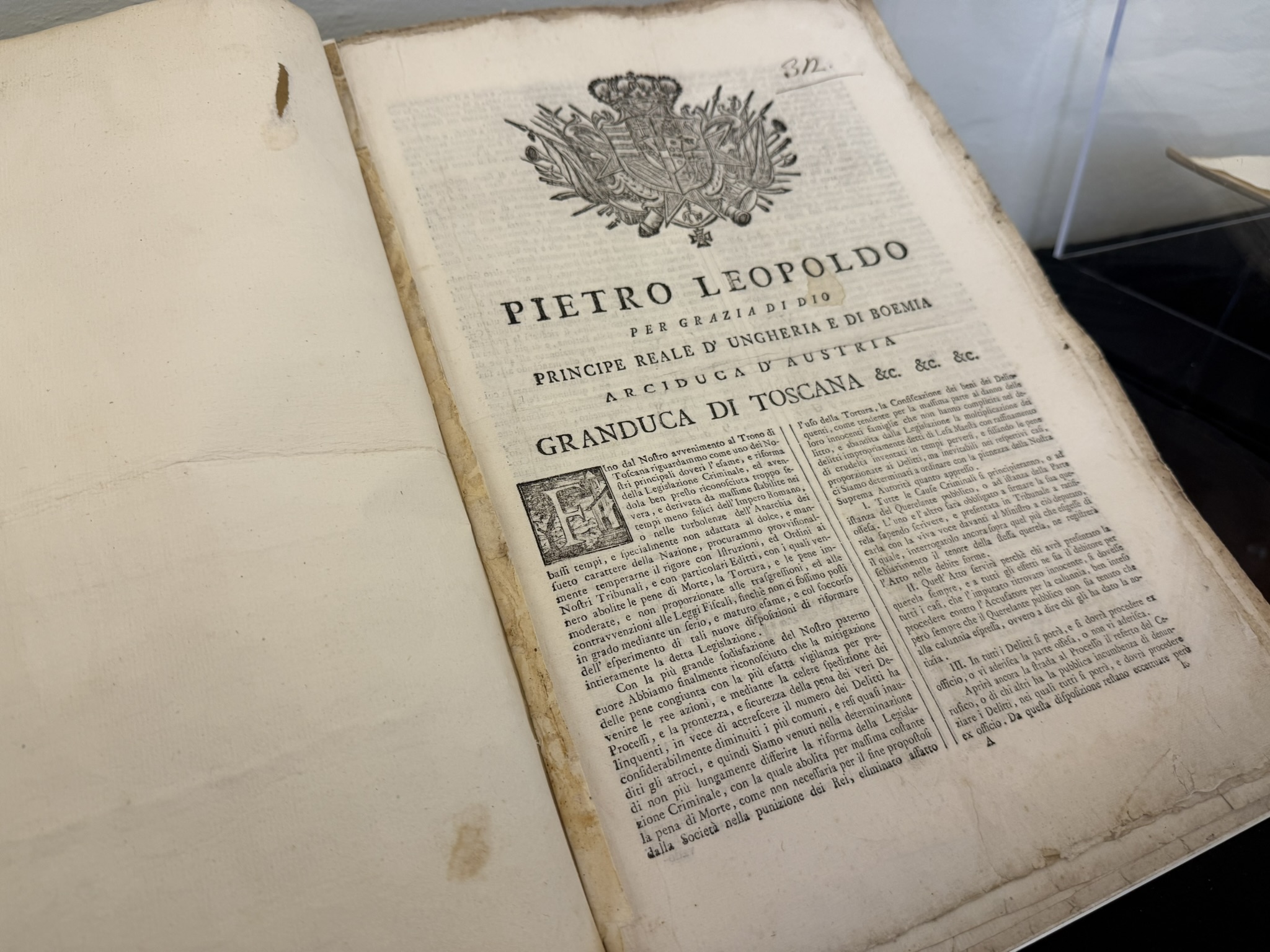 L’iniziativa si inserisce nel contesto delle celebrazioni regionali per il 260° anniversario dell’insediamento di Pietro Leopoldo d’Asburgo Lorena come Granduca di Toscana e vuole rendere omaggio a questa importante personalità che, con il Codice penale del 1786, fece della Toscana il primo Stato al mondo ad abolire la pena di morte. Ma la visione innovativa del sovrano si estese anche ad altri settori. Durante il suo governo fu promossa una serie di profonde riforme politiche, sociali, economiche che segnarono profondamente la Toscana e anticiparono l’età moderna: vennero aboliti i privilegi feudali e introdotto il principio di uguaglianza davanti alla legge; riorganizzato l’apparato statale; resa laica e obbligatoria l’istruzione; abolite le corporazioni dei mestieri; bonificate la Maremma e della Valdichiana, con un miglioramento delle condizioni di vita della popolazione.