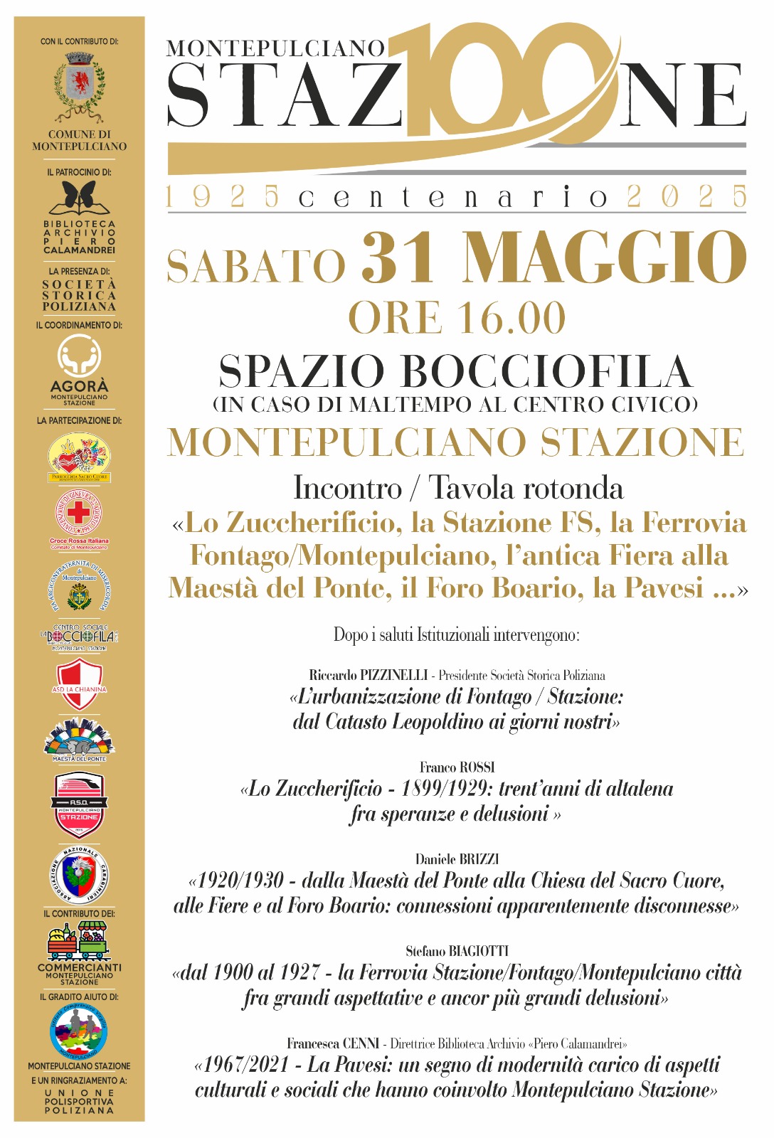 Tra gli eventi di spicco, la tavola rotonda di sabato 31 maggio alle ore 16:00, presso lo Spazio Bocciofila (in caso di maltempo al Centro Civico), dal titolo: “Lo Zuccherificio, la Stazione, la Ferrovia Fontago/Montepulciano, la Fiera alla Maestà del Ponte, il Foro Boario, la Pavesi…”