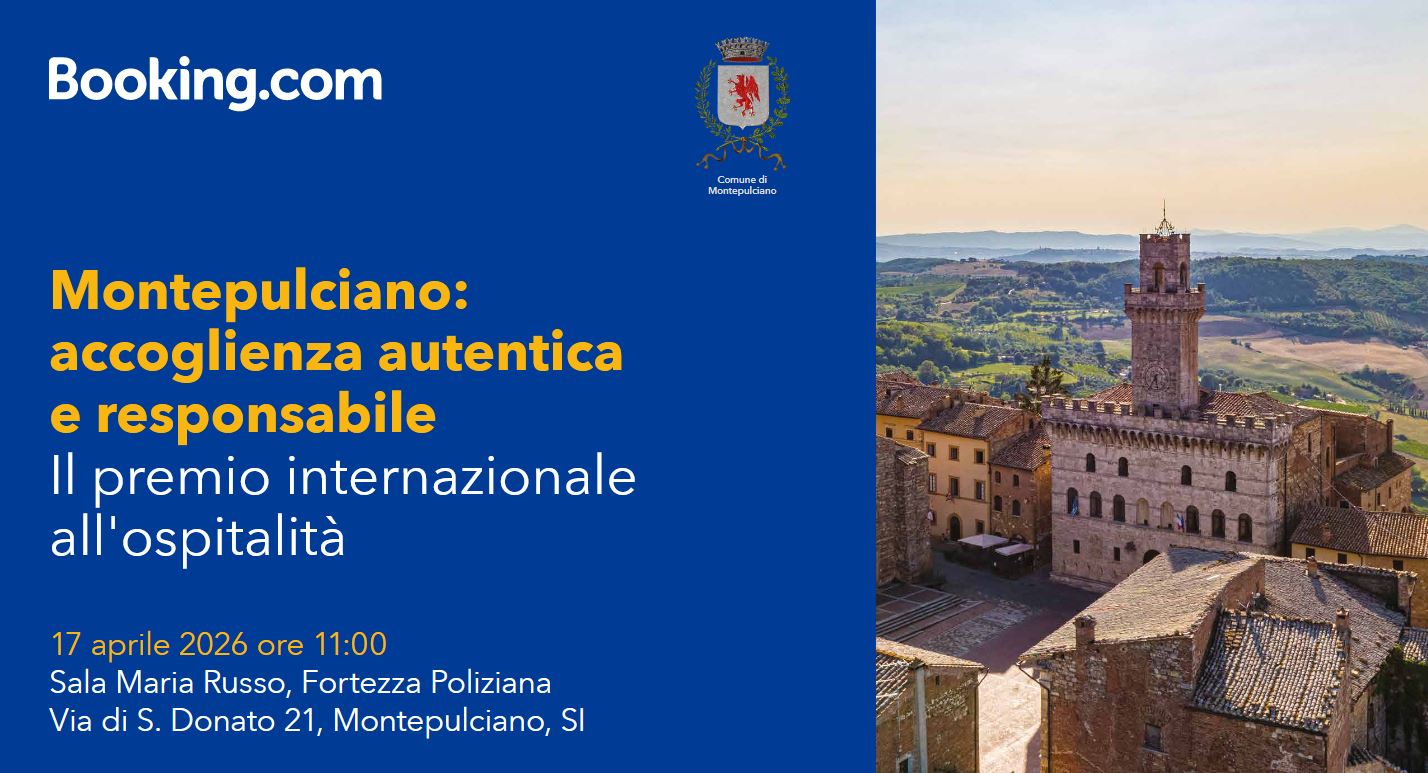 Alla cerimonia di consegna interverranno il sindaco di Montepulciano Michele Angiolini, la direttrice della Strada del Vino Nobile di Montepulciano e dei Sapori della Valdichiana Senese Bruna Caira, il Regional Manager Italia di Booking.com Alessandro Callari e l’assessore al turismo della Regione Toscana Leonardo Marras.