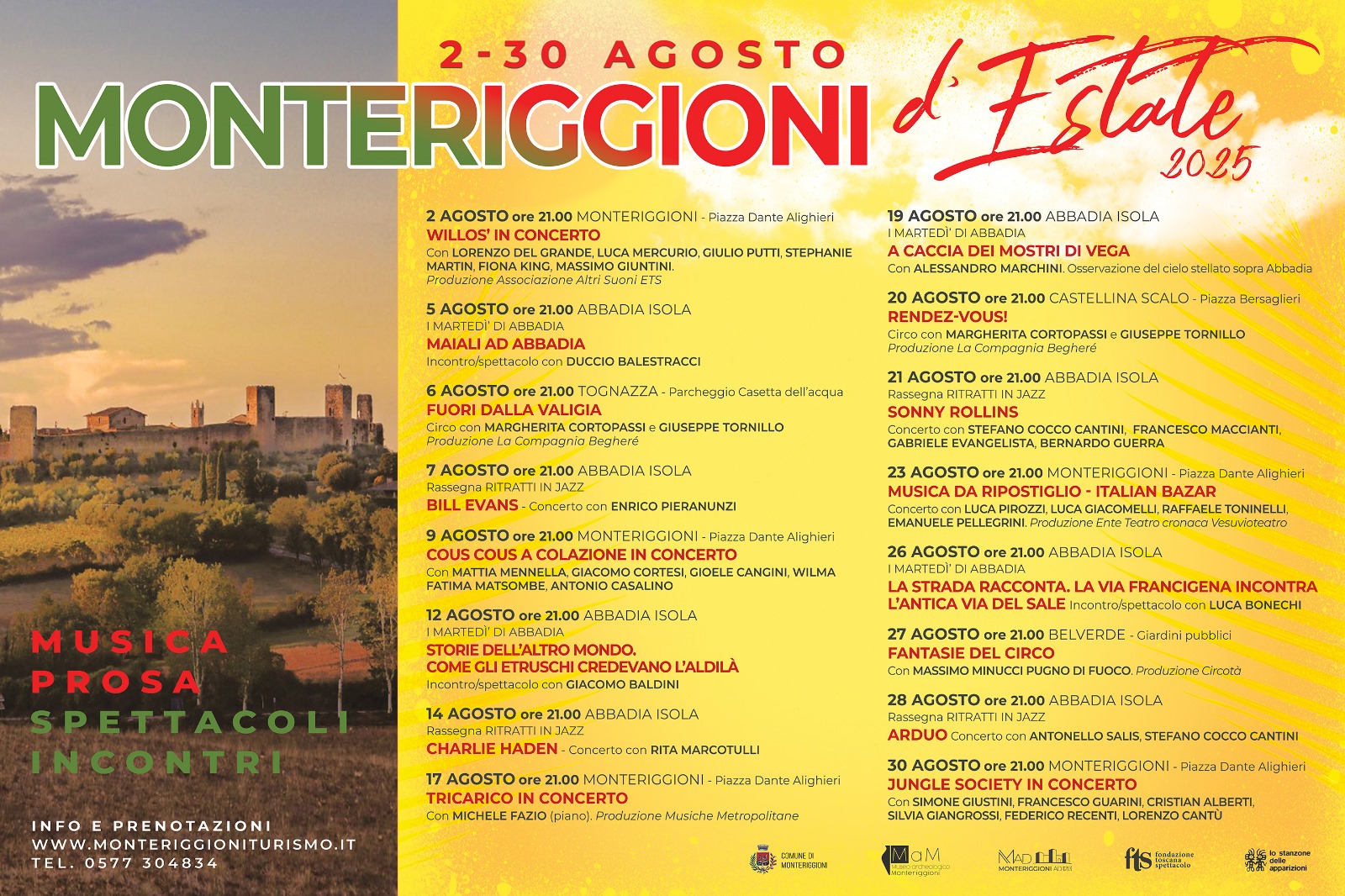 «Il cartellone estivo 2025 rappresenta un impegno concreto dell’Amministrazione comunale per promuovere una cultura di qualità – afferma il Sindaco di Monteriggioni Andrea Frosini –. Stiamo proseguendo con la prospettiva che abbiamo delineato in questi anni, ovvero la realizzazione di un ‘brand’ culturale con delle vere e proprie produzioni ‘made in Monteriggioni’. Abbiamo composto un programma che mette in dialogo la nostra identità storica con linguaggi contemporanei, proponendo un’offerta culturale rivolta sia alla cittadinanza sia ai visitatori che ogni anno scelgono Monteriggioni per la sua unicità».