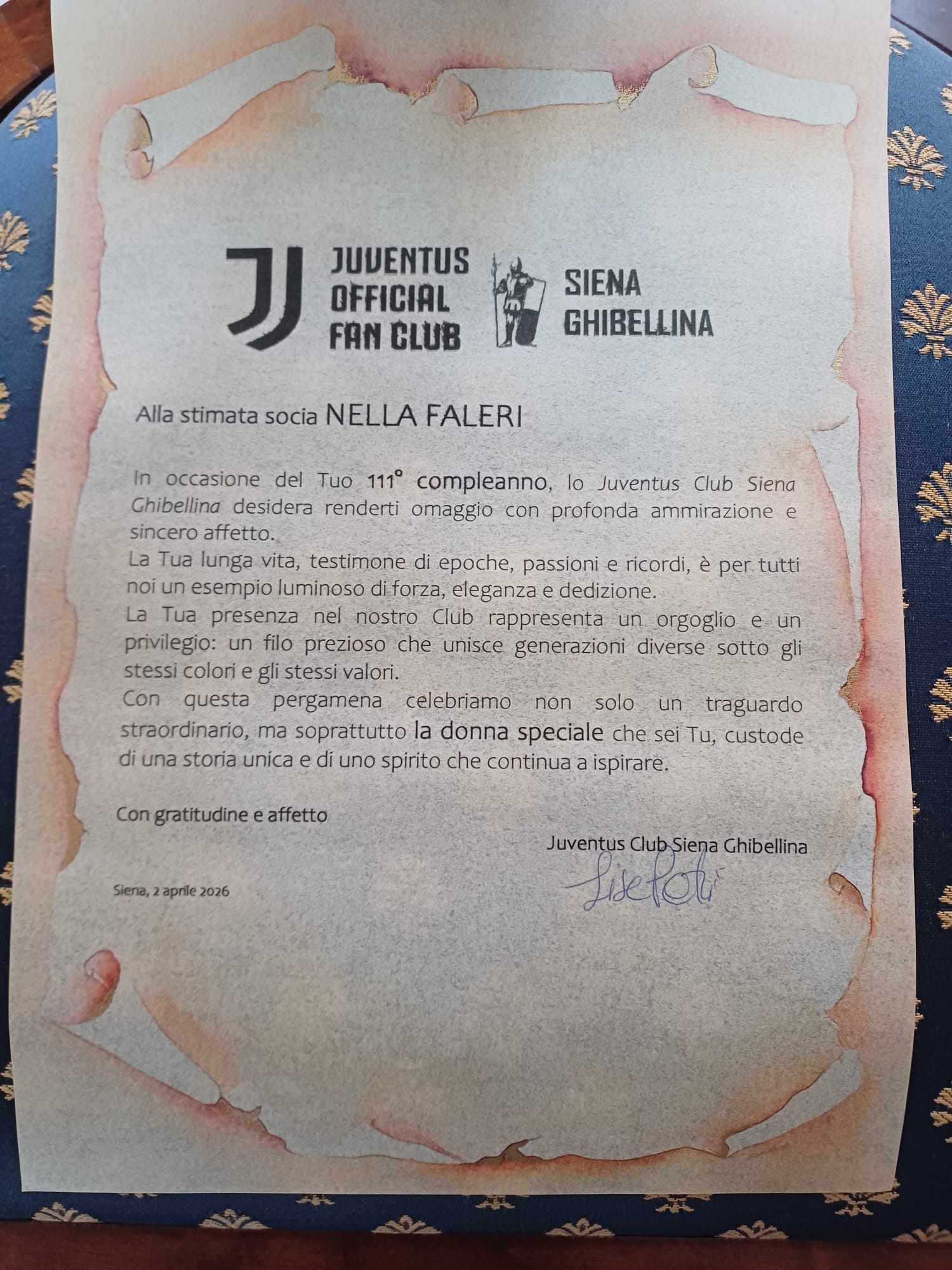 Alla festa ha partecipato anche Lisa Petri, presidente dello Juventus Club Siena Ghibellina, che ha regalato a Nonna Nella, grande tifosa bianconera, una sciarpa della Juventus con dedica speciale. Non solo: è stato organizzato anche un collegamento con la redazione del quotidiano sportivo torinese Tuttosport, che nei prossimi giorni le dedicherà una pagina per celebrare la sua fedeltà alla squadra lungo ben 111 anni di storia.