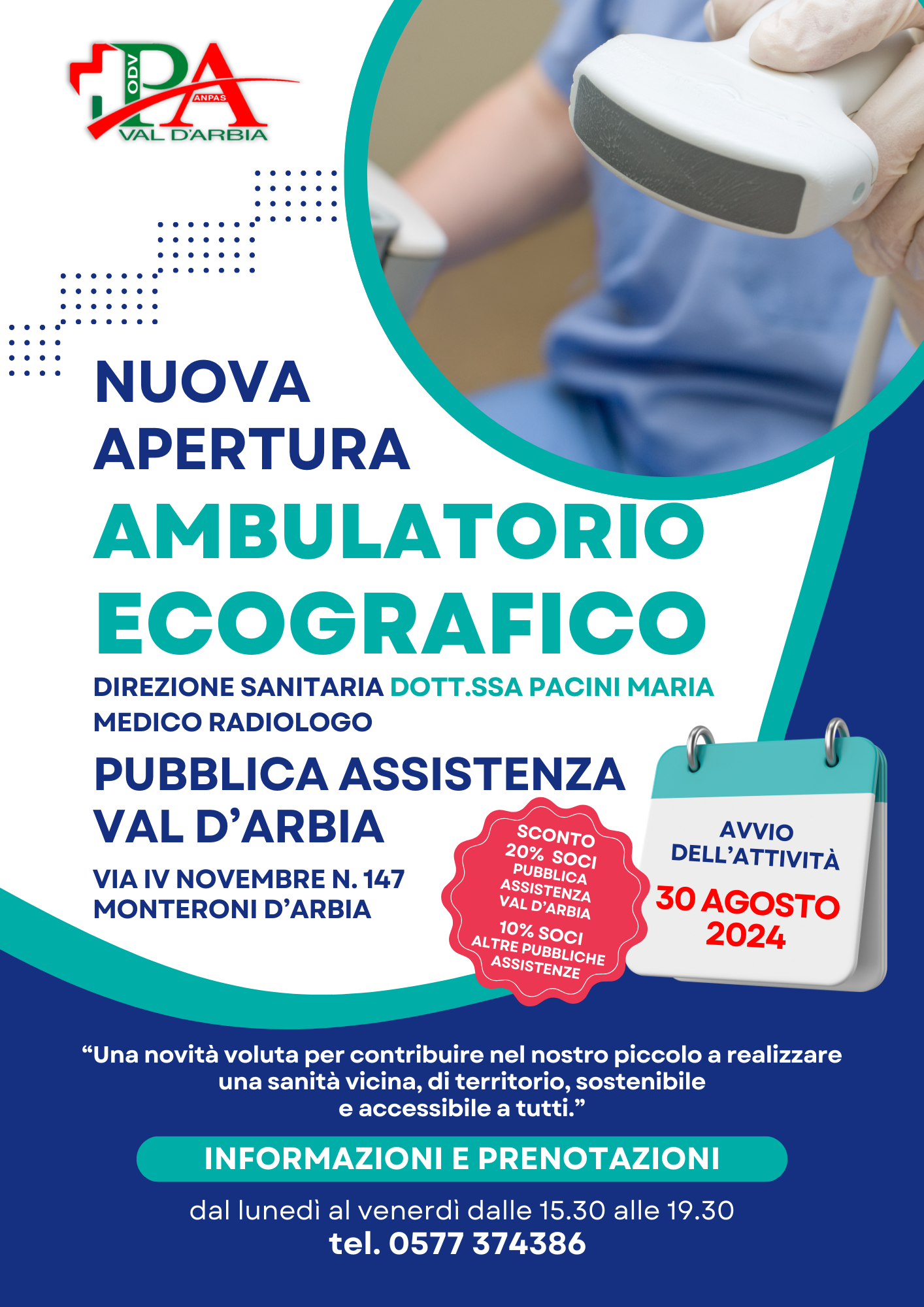 “Da sempre le Pubbliche Assistenze, grazie all’impegno costante delle volontarie e dei volontari e con il prezioso supporto di professionisti sanitari, hanno come primario obiettivo la cura e l’assistenza alle persone e alla comunità”. A raccontarlo in una lettera aperta ai soci e ai cittadini è Massimiliano Fioravanti, presidente della Pubblica Assistenza Val d’Arbia, associazione che sul territorio opera con numerose attività, dal trasporto sanitario alla donazione di sangue, dalla protezione civile alle attività sociali, dall'(in)formazione ai progetti di solidarietà e alle attività socio-ricreative. L’ambulatorio ecografico, che si pregia della direzione sanitaria della Dott.ssa Pacini Maria, medico radiologo, è una novità che nasce proprio dal forte impegno sociale dell’associazione per il territorio, puntando ad offrire ai soci ed alla cittadinanza servizi di qualità, in un’ottica di assistenza costante e puntuale.