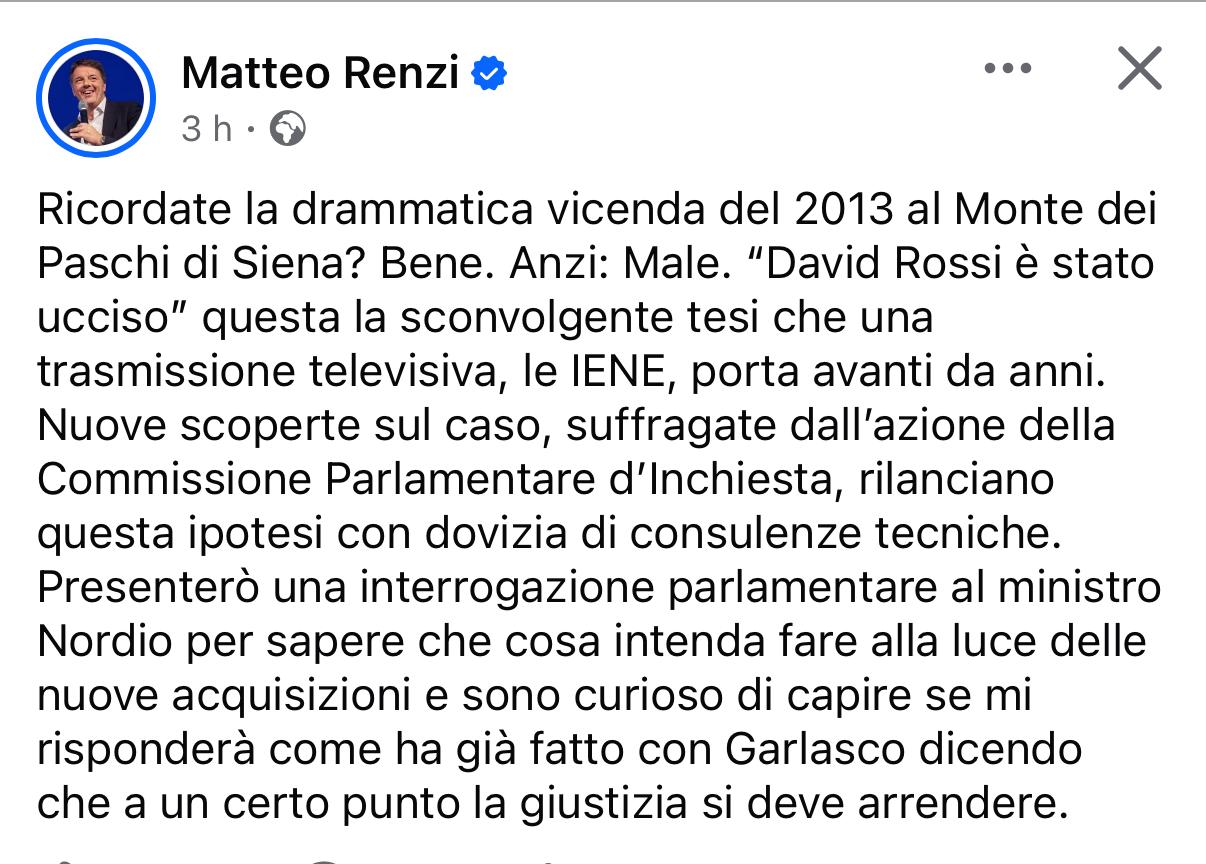 Matteo Renzi è tornato a parlare della drammatica vicenda di David Rossi, il manager del Monte dei Paschi di Siena morto nel 2013, condividendo un post su Facebook in cui annuncia l’intenzione di presentare un’interrogazione parlamentare al ministro della Giustizia, Carlo Nordio.
