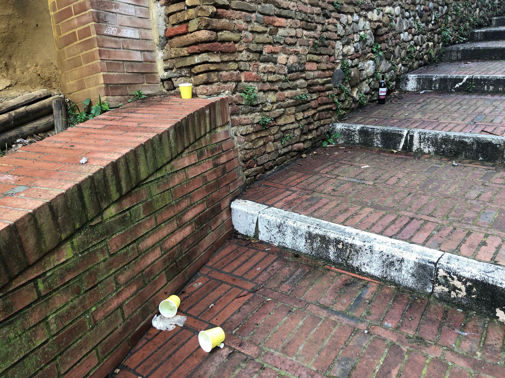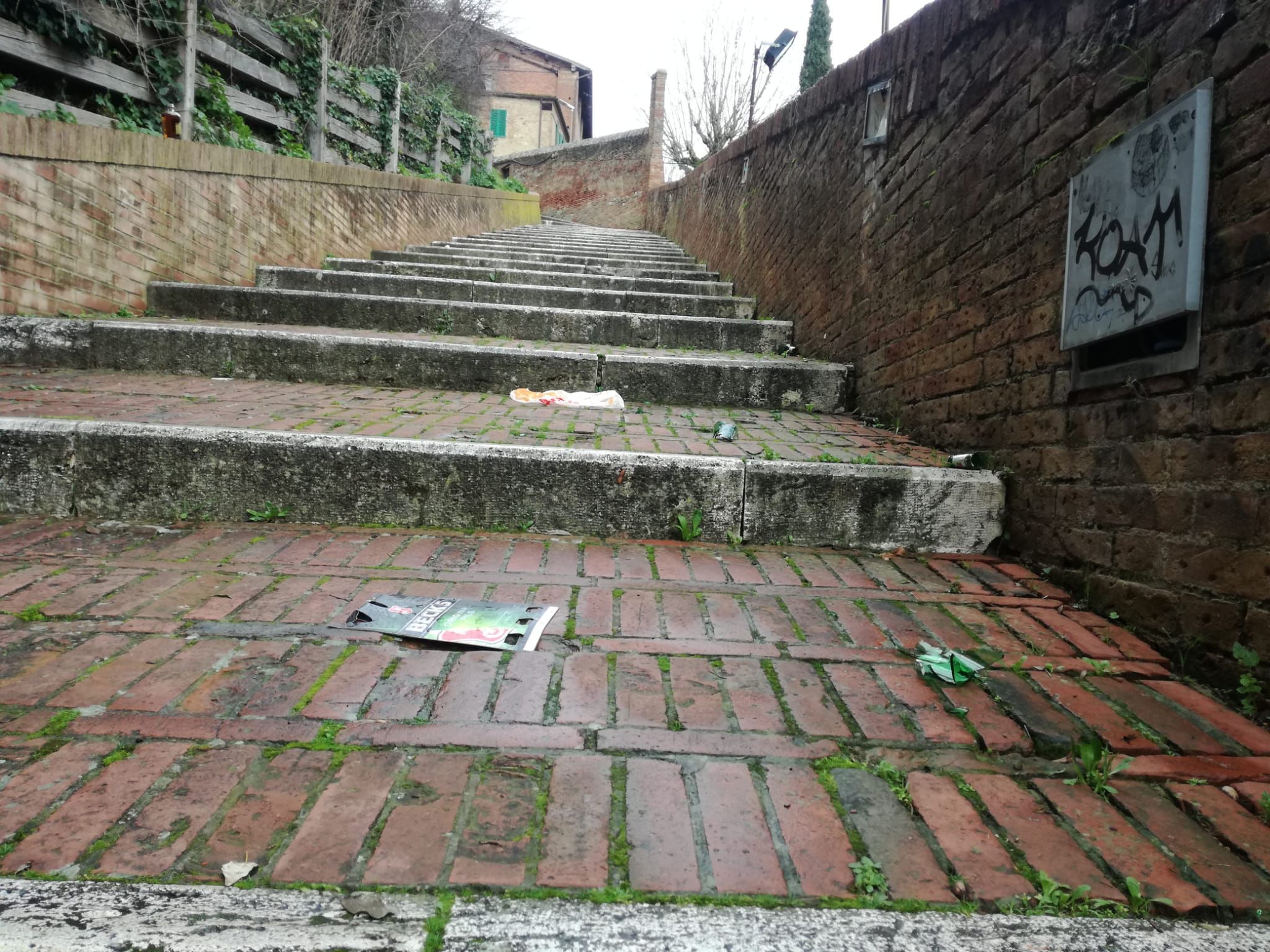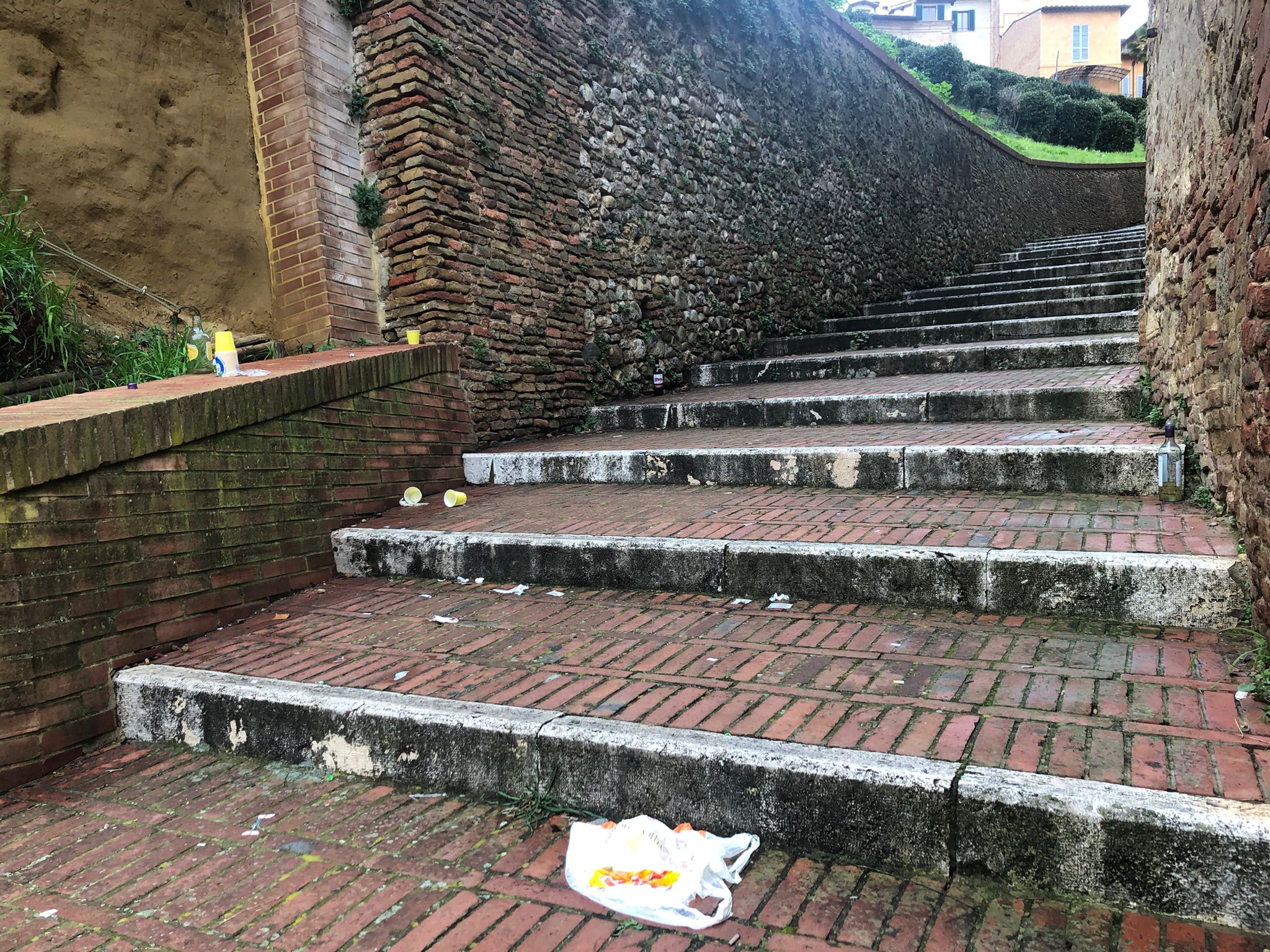 Un sabato all’insegna della “malamovida” a Siena. Non solo la folla di giovani che si è riversata in Piazza del Campo poi cosparsa di rifiuti e sporcizia, nel mirino degli incivili è finita anche la scalinata che collega San Domenico e Fontebranda. Diventata, in alternativa ai bar e locali chiusi dopo le 18 per via delle restrizioni Covid, un luogo di ritrovo per ragazzi e ragazze, dove bere e mangiare.