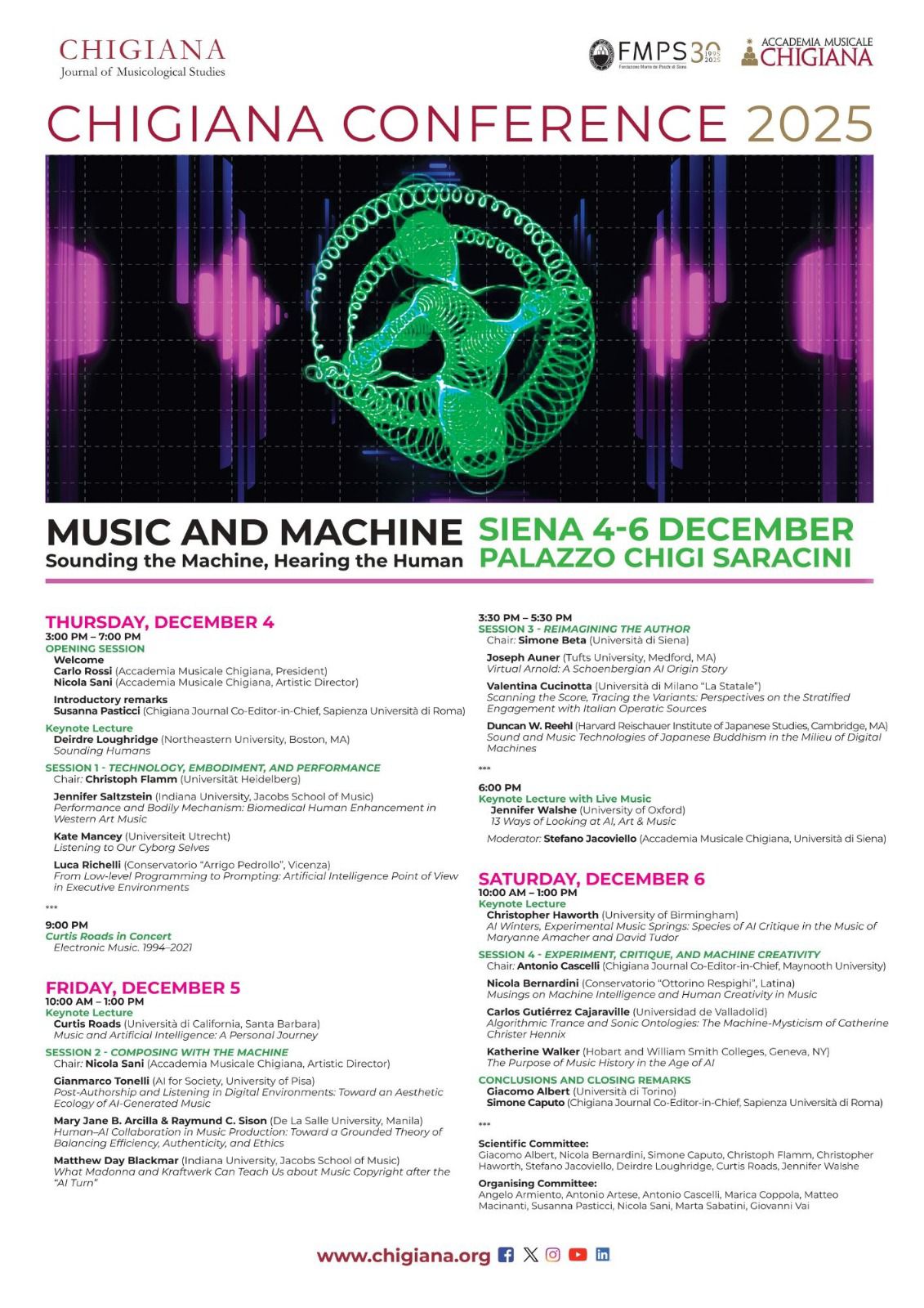 Tra i protagonisti del convegno spicca il compositore e ricercatore Curtis Roads, celebre personalità nel campo della computer music, figura pionieristica e tra le più influenti nel panorama internazionale della musica digitale. La sua partecipazione rappresenta un’occasione unica per osservare da vicino il legame tra creatività umana, tecnologia e intelligenza artificiale. Il 4 dicembre, nel pomeriggio, la keynote lecture di Deirdre Loughridge (Northeastern University, Boston), Sounding Humans, introdurrà i temi fondamentali del convegno, esplorando le relazioni tra corporeità, macchine e AI, e farà da cornice alle attività della giornata. La serata culminerà alle 21:00 nel Salone dei Concerti di Palazzo Chigi Saracini con il concerto di Curtis Roads, dedicato alla sua produzione elettronica dal 1994 al 2021, offrendo al pubblico l’opportunità di ascoltare dal vivo le opere di uno dei compositori che più hanno influenzato il linguaggio della musica elettronica contemporanea. L’ingresso è libero, con prenotazione consigliata.