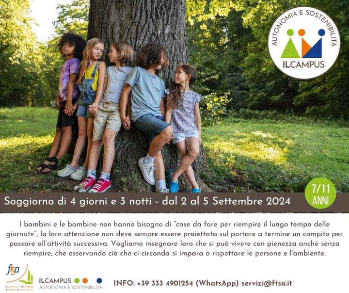 Cosa è Il Campus. Un percorso motivazionale per la crescita personale per aiutare bambini e bambini a sviluppare le soft skills come la fiducia in se stessi, la capacità di adattamento e di stare in un gruppo, che sia di gioco, di lavoro, di sport o di classe. Un’occasione per valorizzare le loro qualità caratteriali. A differenza di molti campus estivi, Il Campus si contraddistingue per proporre attività e laboratori collegati da un filo conduttore educativo e di crescita personale, che intende sviluppare l’autonomia del bambino e della bambina. Nell’ambito delle singole attività i programmi di dettaglio saranno definiti e co-costruiti con loro. Con il laboratorio di sana e corretta alimentazione i bambini saranno protagonisti nella spesa e nella preparazione dei pasti; con l’aiuto della guida ambientale conosceranno il territorio e sceglieranno insieme le escursioni; con l’esperto teatrale saranno protagonisti e registi. Fare teatro diventerà l’occasione per migliorare autostima e costruire l’idea di se. Sistemare il proprio bagaglio sarà un modo per imparare a gestire gli spazi privati e quelli condivisi. Passare del tempo nell’orto aiuterà a capire cosa offre la natura, a scegliere insieme cosa mangiare e provare a cucinarlo Un pigiama party serale potrà essere lo scenario ideale per raccontarsi e condividere i propri sogni. E ancora un’escursione di trekking con guida ambientale servirà ad imparare ad aspettare chi ha un passo diverso e scegliere insieme la strada da seguire.