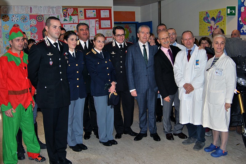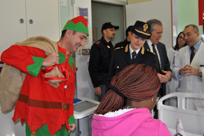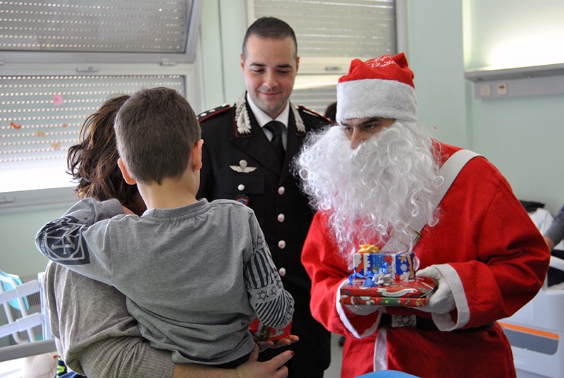 Una mattinata speciale nel Dipartimento Materno-Infantile del policlinico Santa Maria alle Scotte, grazie alla visita dell’Arma dei Carabinieri, della Polizia di Stato e dell’Associazione Nazionale Carabinieri che hanno portato doni, regali e sorrisi per i piccoli pazienti, insieme ad un reciproco scambio di auguri per le festività natalizie con i professionisti dell’Azienda ospedaliero-universitaria Senese e le famiglie dei piccoli degenti. Una piacevole visita, allietata dalla presenza di Babbo Natale e del Signor Elfo che, come da tradizione, anima i giorni che precedono il Natale. Hanno partecipato all’evento il questore di Siena, Maurizio Piccolotti, e il comandante provinciale dell’Arma dei Carabinieri, colonnello Stefano di Pace. A fare gli onori di casa il direttore generale, Valtere Giovannini, insieme al direttore amministrativo, Enrico Volpe, al professor Mario Messina, direttore del Dipartimento Materno-Infantile, al professor Salvatore Grosso, direttore della Pediatria, e a tutti i professionisti del Dipartimento.