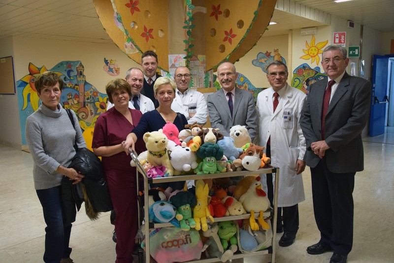 Primo appuntamento di Natale nel Dipartimento Materno-Infantile del policlinico Santa Maria alle Scotte. Sono stati i dipendenti dei negozi Coop Le Grondaie e Celso Cittadini, con il supporto del Comitato soci Coop di Siena, a inaugurare il ricco calendario delle Feste all’Azienda ospedaliero-universitaria Senese, donando peluches ai piccoli pazienti ricoverati all’ospedale di Siena e regalando un pomeriggio di sorrisi e divertimento per i giovani degenti e le loro famiglie. Presenti all’iniziativa Valtere Giovannini, direttore generale dell’Aou Senese; il professor Mario Messina, direttore del Dipartimento Materno-Infantile e della UOC Chirurgia pediatrica; il professor Salvatore Grosso, direttore della UOC Pediatria; il professor Giuseppe Buonocore, direttore UOC Terapia intensiva neonatale e la coordinatrice infermieristica Giuliana Masiero. Per Coop hanno preso parte all’iniziativa Gianfranco Fineschi, vicepresidente Comitato soci Coop di Siena; Claudio Terrosi, direttore del punto vendita Le Grondaie; Amelia Pizzi, rappresentante dei dipendenti Coop di Siena; insieme a Letizia Calosi ed Elvira Facco, rappresentanti del Comitato soci Coop di Siena.
