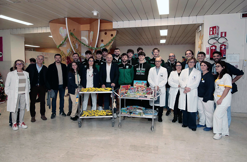 Giocattoli e libri ma anche tanti momenti di leggerezza, allegria e spensieratezza per i più piccoli pazienti delle Scotte e per le loro famiglie. Numerosi i professionisti che hanno accolto la delegazione biancoverde, a partire dal professor Salvatore Grosso, direttore della Pediatria, la dottoressa Alessandra Taddei, in rappresentanza della Chirurgia pediatrica, la dottoressa Sabrina Buoni, della Neuropsichiatria infantile, oltre alle infermiere e le OSS che operano nei vari reparti. A rappresentare la direzione sanitaria la dottoressa Claudia Basagni. Per la Mens Sana Basketball erano presenti il presidente Francesco Frati, il direttore generale Riccardo Caliani, il direttore operativo Arcangelo Galasso, il responsabile del settore giovanile Pierfrancesco Binella, insieme ai giocatori Vittorio Tognazzi, Gianluca Prosek, Daniele Marrucci, Jacopo Ragusa, Luigi Maghelli e alcuni rappresentanti del settore giovanile biancoverde.