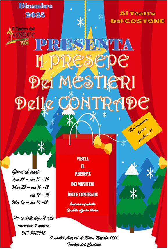 Il Presepe dei Mestieri e delle Contrade quest’anno è esposto pubblicamente da lunedì 22 dicembre al Teatro del Costone, in via del Costone 9, a Siena.