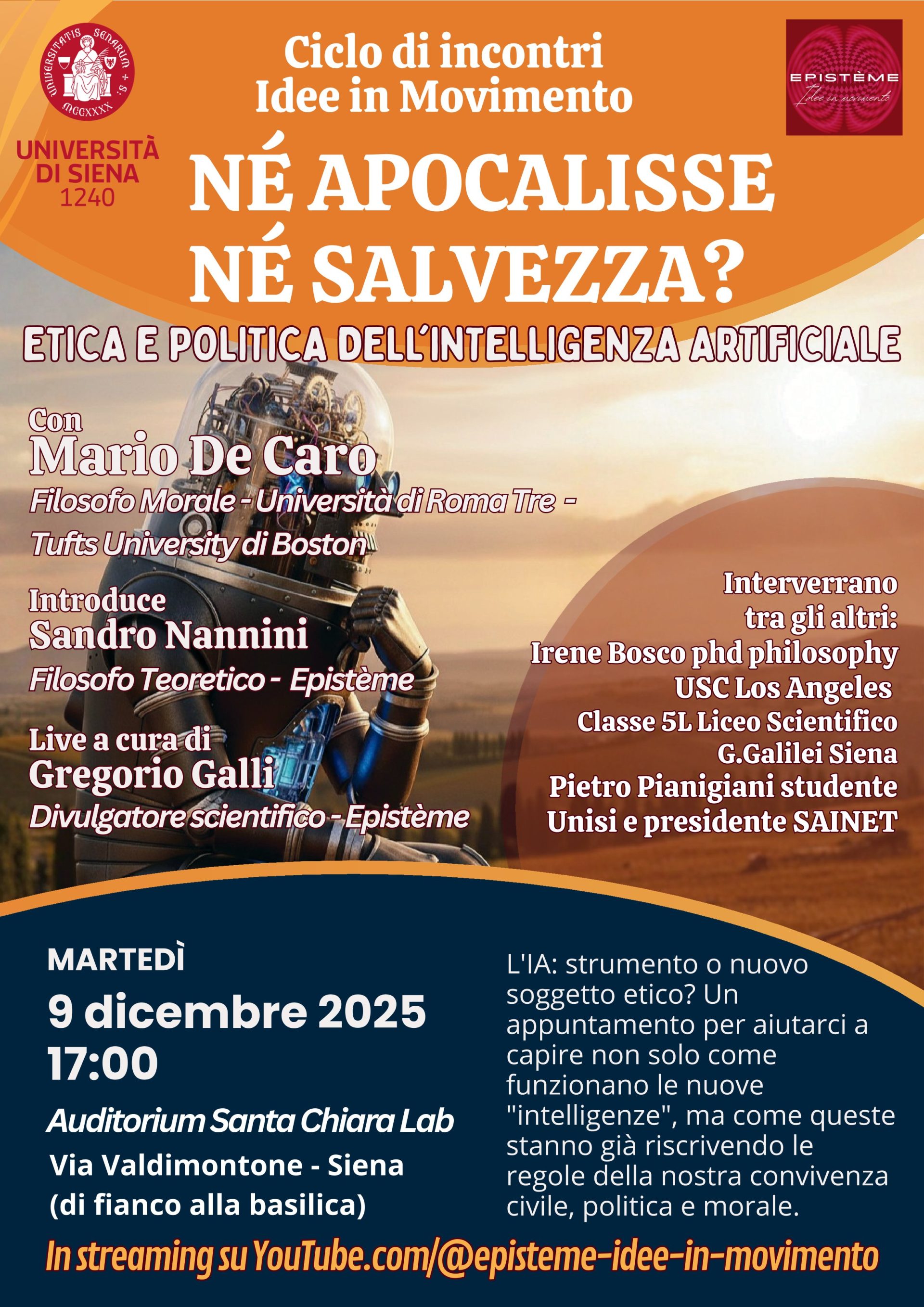 Martedì 9 dicembre 2025, alle ore 17:00, nell’Auditorium Santa Chiara Lab dell’Università di Siena (Via Valdimontone) si terrà la conferenza “Né apocalisse né salvezza?” (https://terzamissione.unisi.it/home/public-engagement/progetti/idee-in-movimento), con la partecipazione di Mario De Caro, ordinario di Filosofia morale all’Università Roma Tre, e l’Introduzione del professor Sandro Nannini, filosofo teorico. L’incontro fa parte del programma “Idee in Movimento”, un ciclo di conferenze e incontri nati dalla collaborazione tra l’Università di Siena e il Circolo culturale “Epistème” con l’obiettivo di investigare la relazione tra il progresso tecnico-scientifico e il senso comune, e rientra tra le iniziative di Terza Missione e Public Engagement dell’Ateneo.